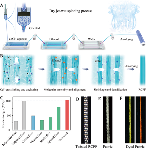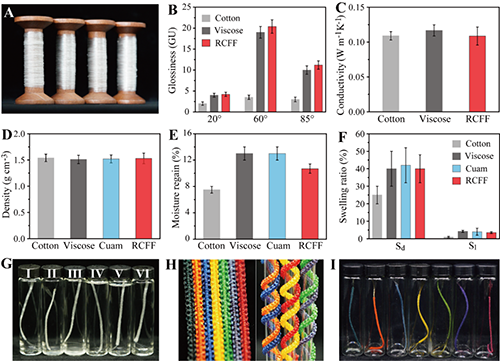 除了卓越的力学性能,RCFF在功能性方面同样表现出色。其热导率为0.11 W m?1 K?1,介于棉与粘胶纤维之间,适用于保暖服装;回潮率为11%,媲美于粘胶纤维和铜氨纤维,兼具舒适性与尺寸稳定性。纤维在酸、碱及有机溶剂中均表现出良好的化学稳定性,同时RCFF具备优异的染色性能,色彩鲜艳持久(图4)。整个生产过程实现了闭环绿色制造,能耗远低于传统NMMO法或粘胶法,且原料成本低廉,具有良好的经济性与环境友好性。该技术不仅为高性能纤维素纤维的规模化生产提供了全新路径,还有望替代石油基合成纤维,推动纺织行业向可持续发展转型。