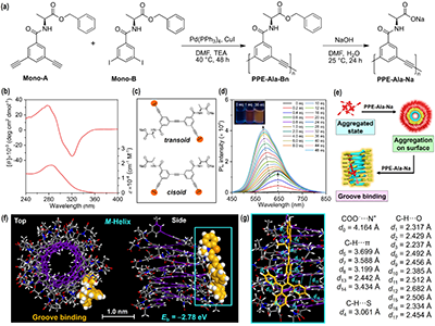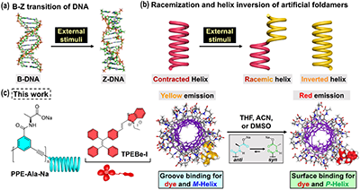 DNA、蛋白质和多糖等生物大分子具有独特的螺旋结构。这些结构与识别、催化、复制、遗传信息存储等多种生物活性密切相关。从仿生学角度来看,人工折叠体因其能够模拟生物大分子二级结构的折叠行为,且其螺旋方向易于调控从而备受关注。传统的圆二色(CD)光谱技术不够直观,另外,通过高分辨率原子力显微镜(AFM)直接观测螺旋结构具有样品制备过程耗时繁琐的缺点。因此,开发一种简便、快速、经济的方法来直接观测和监控螺旋反转行为具有重要价值。