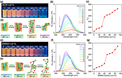 图4 折叠体在水/乙腈和水/二甲基亚砜混合溶剂中螺旋反转的荧光可视化