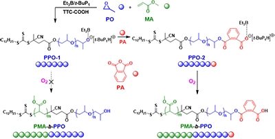 以环氧丙烷(PO)开环均聚反应到丙烯酸甲酯(MA)RAFT聚合反应的串联为例,强亲核性烷氧基活性物种与三乙基硼(Et3B)紧密结合,从而抑制其与氧气反应生成自由基。加入酸酐后,烷氧基物种可高效、定量转化为亲核性较弱的羧酸根物种,通入氧气可有效启动RAFT聚合反应,生成聚丙烯酸酯- b-聚醚两嵌段共聚物PMA-b-PPO。