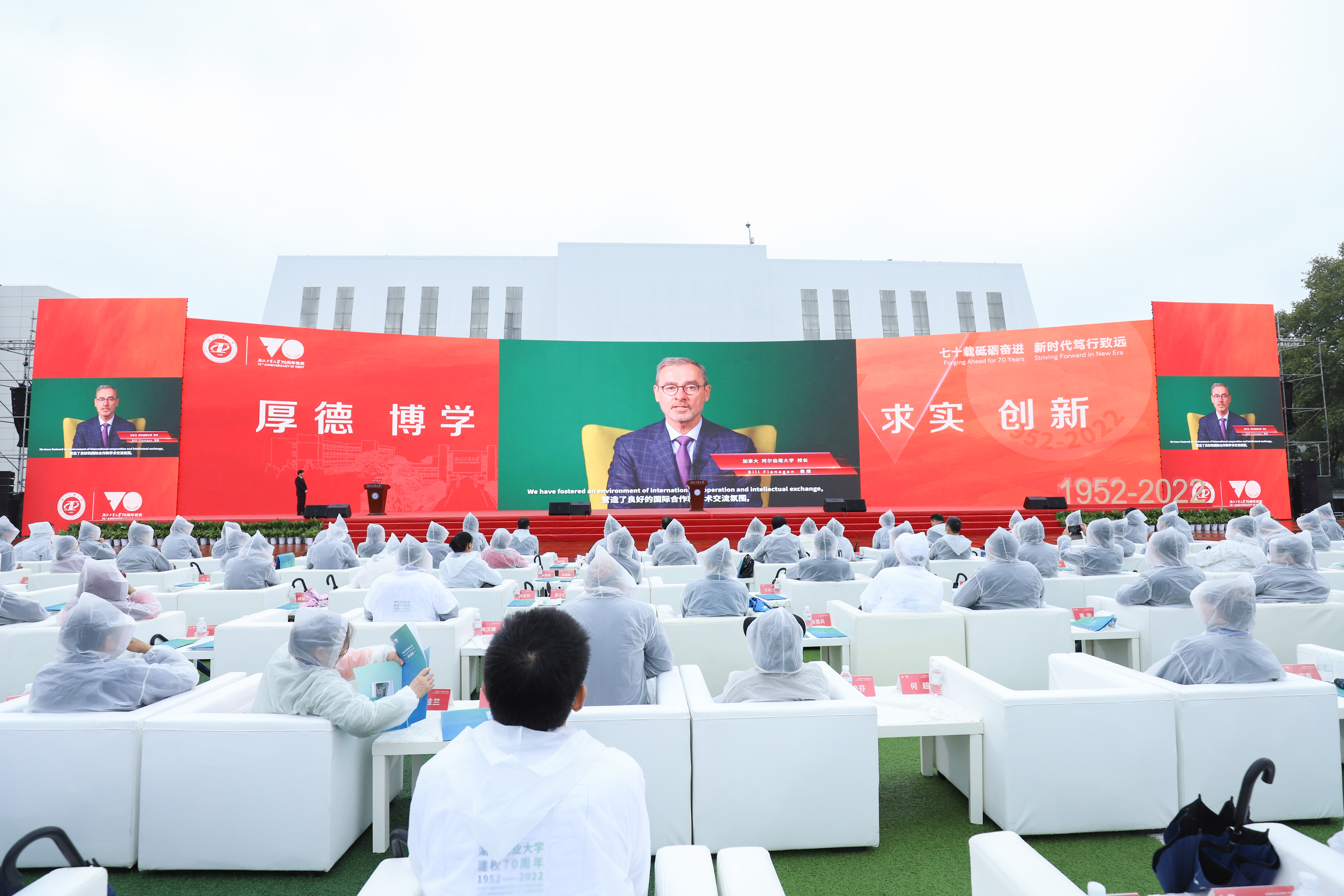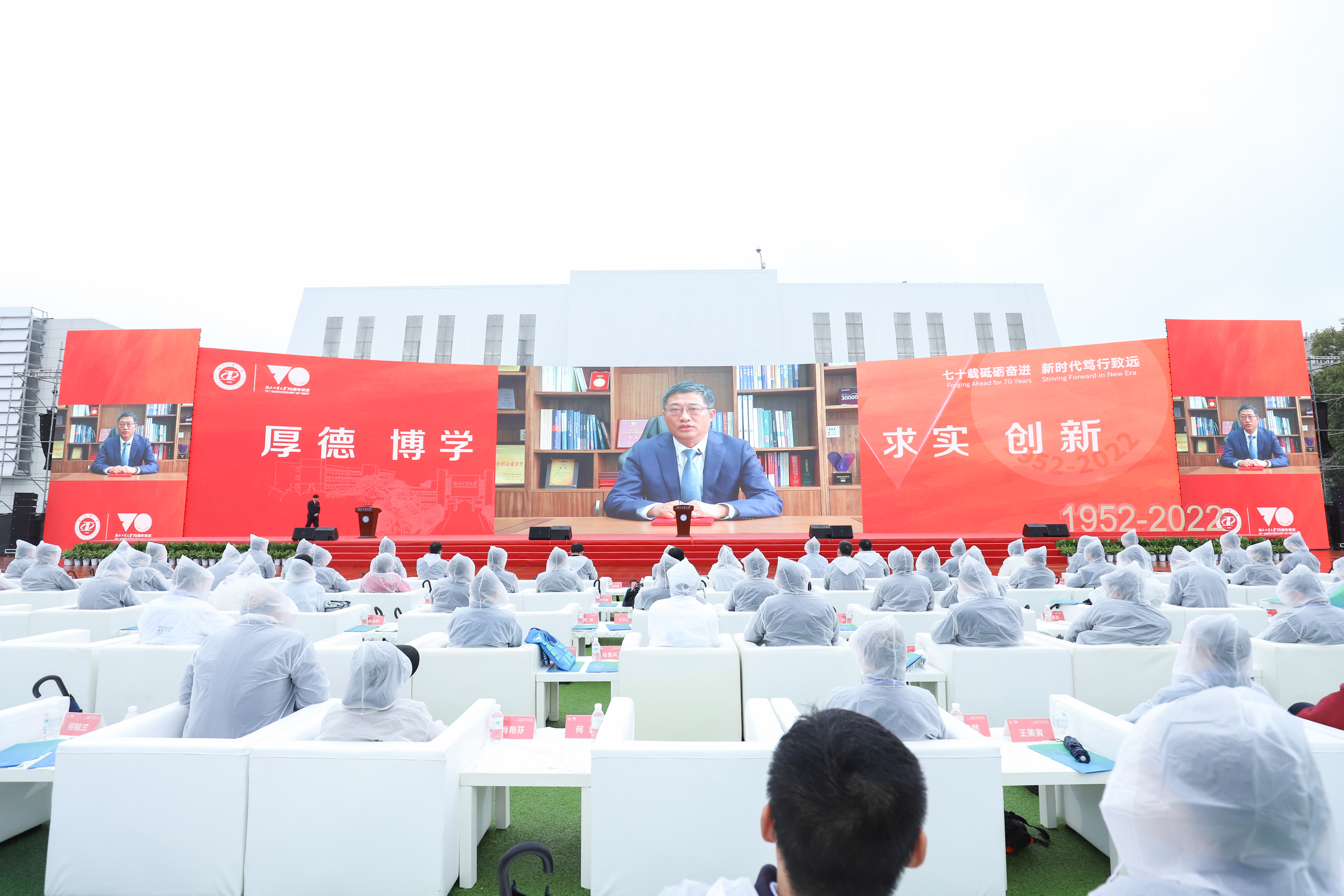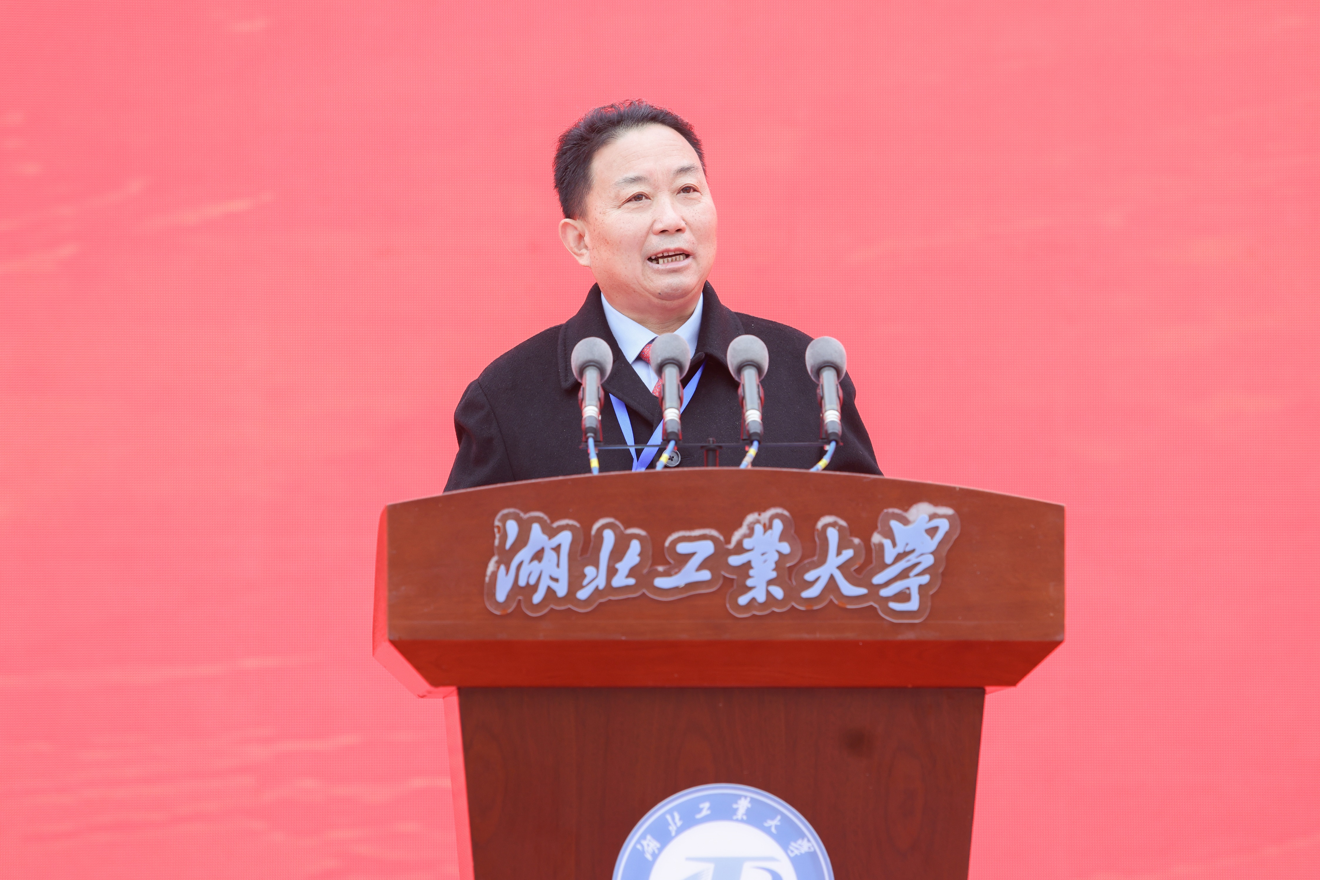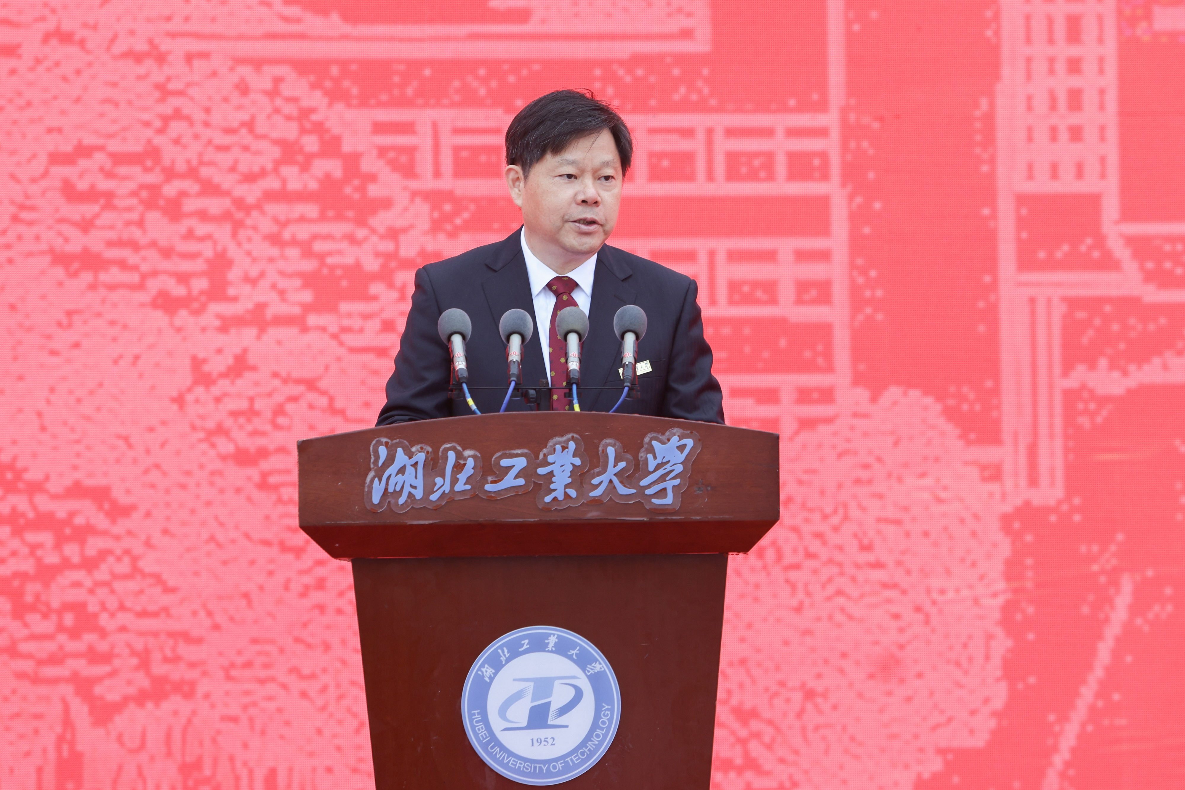 刘德富在主持中表示,今天我们在这里举行庆祝建校70周年暨合作发展大会,是我们对奋斗历程的回顾总结,更是我们擘画未来、奋进发展新征程的起点。站在“两个一百年”奋斗目标的历史交汇点上,湖北工业大学全体师生将更加紧密地团结在以习近平同志为核心的党中央周围,坚持以习近平新时代中国特色社会主义思想为指导,胸怀中华民族伟大复兴的战略全局和世界百年未有之大变局,坚守为党育人、为国育才初心使命,坚持“立足湖北、服务工业”办学定位,主动抢抓机遇,加快推进绿色工业学科特色鲜明的高水平工业大学建设,为湖北“建成支点、走在前列、谱写新篇”、建设全国构建新发展格局先行区和全面建设社会主义现代化国家,作出新的更大的贡献!