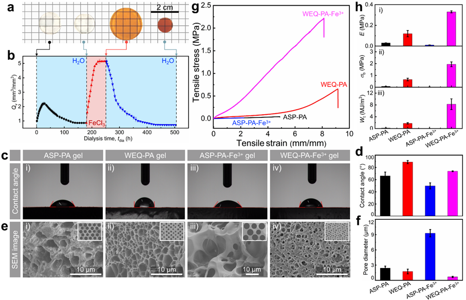 为了实现由离子键和金属配位键协同增强增韧PA水凝胶的目的,该研究工作提出了一种简单的“二次平衡方法”。在该方法中,首先将由离子键构成的原始PA水凝胶浸泡于具有配位能力的多价金属离子溶液中透析直至溶胀平衡,然后将上述平衡的水凝胶浸泡于去离子水中透析除去自由的金属离子(及其反离子)直至再次达到平衡,最后得到强韧性PA水凝胶。该方法在PA水凝胶网络中同时引入了离子键和金属配位键,能够有效地优化水凝胶网络结构,实现协同强韧化的目的。