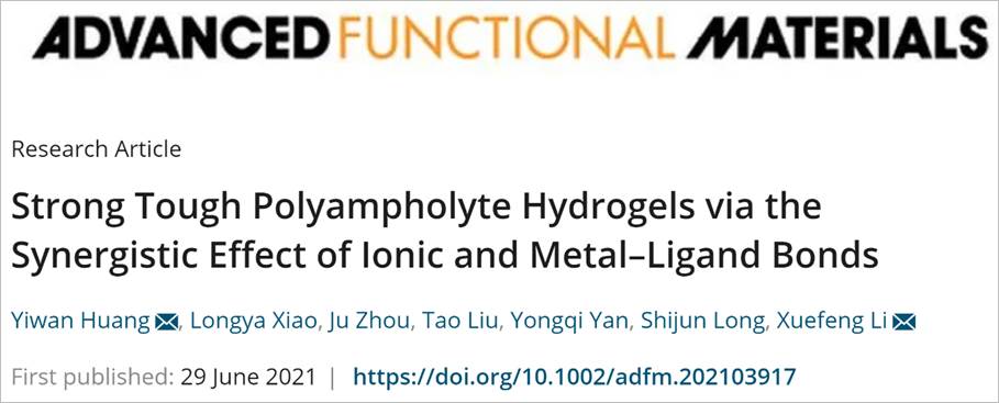 近日,材料与化学工程学院、绿色轻工材料湖北省重点实验室、绿色轻质材料与加工协同创新中心黄以万/李学锋课题组在材料类国际重要期刊Advanced Functional Materials(《先进功能材料》,IF=18.81)在线发表高分子水凝胶强韧化方面的最新研究成果,相关论文题目为“Strong Tough Polyampholyte Hydrogels via the Synergistic Effect of Ionic and Metal–Ligand Bonds”(https://onlinelibrary.wiley.com/doi/10.1002/adfm.202103917)。我校为唯一署名单位,黄以万副教授和李学锋教授为共同通讯作者,黄以万副教授为第一作者,论文主要实验工作由硕士生肖龙亚(已被录取为华南理工大学博士研究生)完成,参与本研究工作的还有团队成员龙世军副教授、硕士生周菊、刘涛及本科生晏永奇。该研究工作获得国家自然科学基金(51903079, 52073083)、武汉市科学技术局应用基础前沿项目(2019010701011397)等项目的资助。成果在线发表后受到各类媒体的广泛关注,包括网易新闻(https://www.163.com/dy/article/GDTG0TJV05329TW8.html)、高分子科技、中国聚合物网及高分子前沿等多家追踪报道。