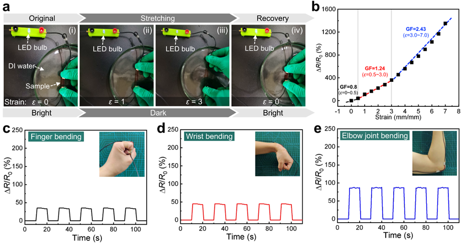 该研究工作通过选择不同的原始PA水凝胶体系和不同的多价金属离子,验证了所提出方法具有一定的普适性。值得一提的是,尽管所制备的水凝胶样品含有约50 wt%的水分,其最高杨氏模量仍然可达19.9±0.3 MPa,拉伸断裂强度可达4.2± 0.1MPa,拉伸断裂功可达10.5±0.6 MJ/m3,同时水凝胶样品还可保持较高的可拉伸性(ε= 4.6± 0.1 m/m)。此外,提高水凝胶离子导电性的常用方法之一是在水凝胶网络中引入可自由迁移的盐离子,但此类水凝胶可能在水环境中导电性不稳定;通过该研究工作所提出的方法有效地避免了这一问题,所制备的水凝胶即使在水中平衡状态下也表现出稳定的离子导电性,在应变传感器领域表现出应用前景。