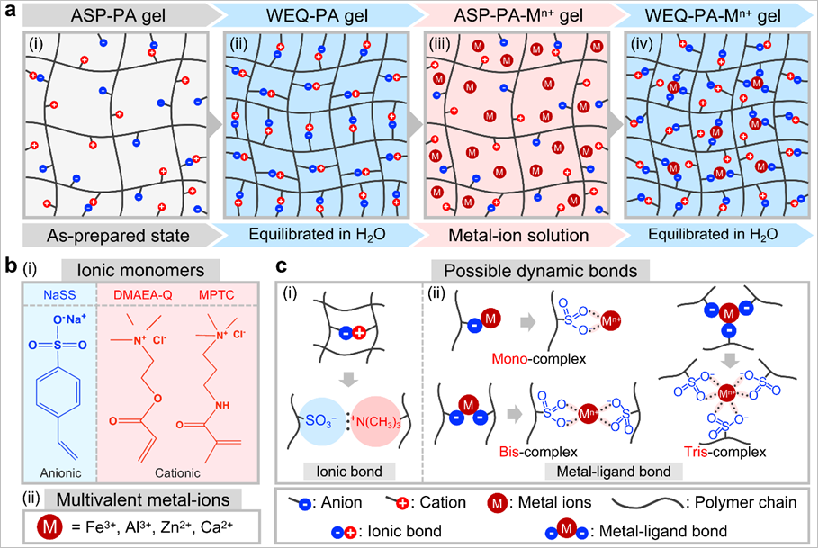 虽然存在于生物体系中,但是开发由离子键和金属配位键协同增强的聚两性电解质(Polyampholyte, PA)水凝胶网络仍具有挑战性。尽管金属配位键交联增强普通聚电解质水凝胶是目前通常采用的手段之一(如Fe3+交联的聚丙烯酸水凝胶),但PA水凝胶在金属盐溶液中表现出显著的“反聚电解质效应”,导致随着金属离子浓度升高水凝胶样品表现出显著的体积溶胀和力学弱化行为。
