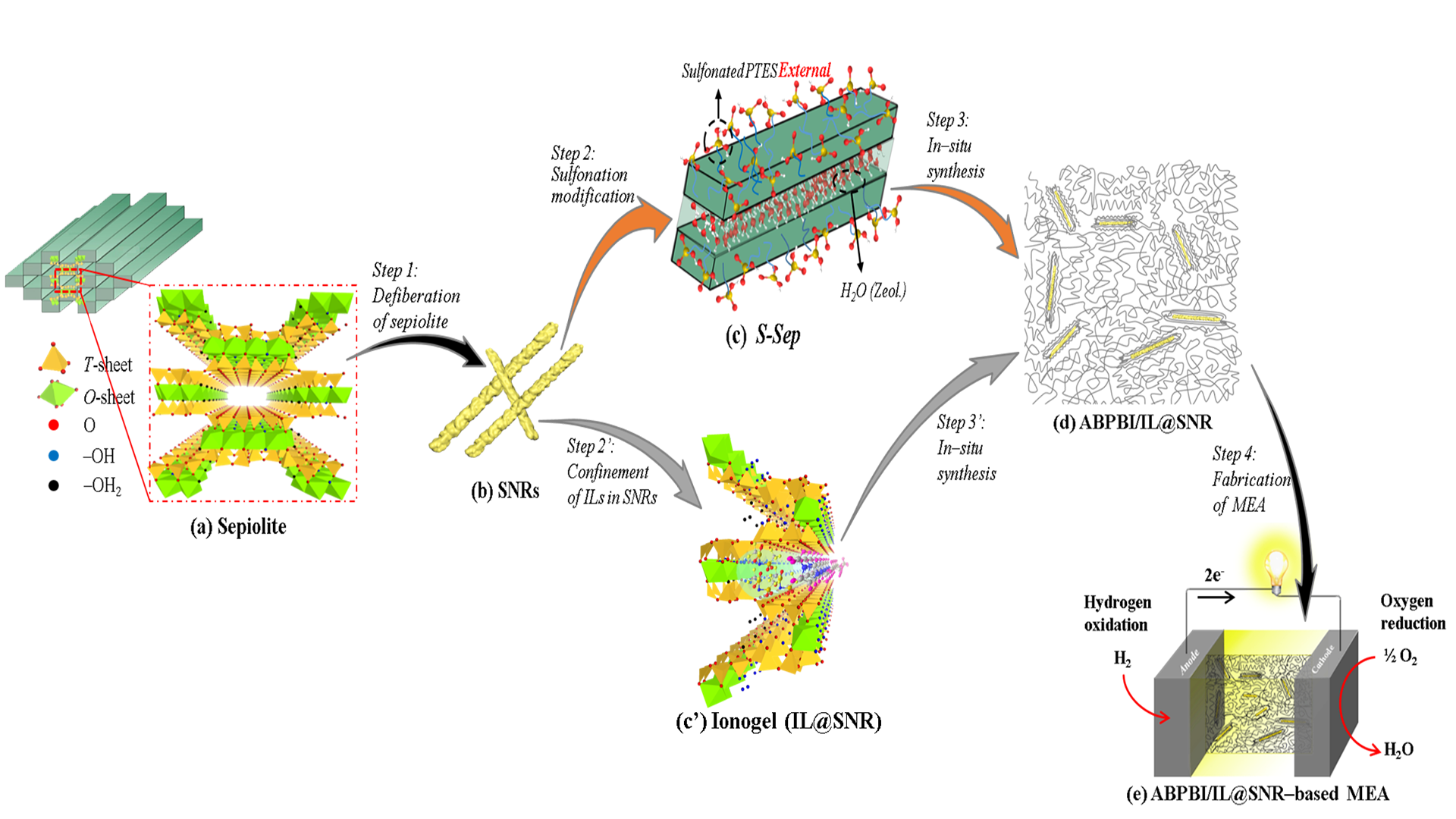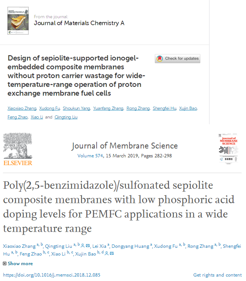 作为氢质子交换膜燃料电池(PEMFC)的核心部件,质子交换膜材料目前主要采用DuPont公司的全氟磺酸树脂膜(Nafion)和BASF公司的聚苯并咪唑膜(CelTeck)。前者仅适用于低温高湿环境(如温度≤ 85°C、相对湿度≥ 80%),后者仅适用于高温无水环境(如120~160°C)。PEMFC仅适用于各自狭窄的温度区间以及对湿度环境的苛刻要求,限制了电池系统能效高和启动快等优势的发挥,发展适合宽温域和无加湿环境下稳定运行的膜材料具有重要意义。该研究团队成员刘清亭博士利用天然矿物质海泡石(Sepiolite)的独特纳米孔道特征,分别采取离子液体受限填充和偶联剂表面修饰的改性手段得到硅纳米棒(SNR),然后原位合成制备出高性能复合膜。基于该类膜材料的电池在40~180°C温度范围电性能良好,体现出具备宽温域应用前景。