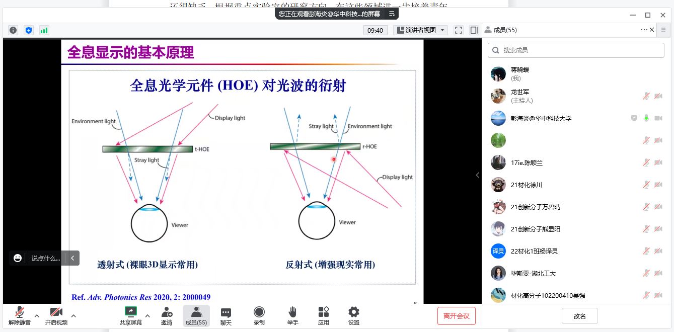 彭海炎教授首先介绍了全息高分子纳米复合材料的特点以及应用。全息高分子纳米复合材料是一类新兴的光学材料,在高端防伪、增强现实和全息战术地图等高新技术领域应用前景广阔。这类材料通过相干激光聚合诱导相分离原理加工制造,关键科学问题是反应动力学调控和多相多组分协同。报告重点介绍了四个方面:(1) 新概念“光引发阻聚剂”通过“引发聚合-阻聚协同”调控光聚合反应动力学,促进有序相分离; (2) 液晶与上转换纳米粒子、聚集诱导发光分子等多相多组分协同,实现全息图像与发光图像的正交存储、无串扰显示及协同温敏响应; (3) 自由基逐步聚合突破高黏度复合体系有序相分离瓶颈,实现裸眼可见彩色三维图像的柔性存储与显示。报告结束后,参加会议的师生与彭海炎教授就相关问题进行了深入的讨论,与会人员从中受益匪浅,反响很好。这次学术报告的召开为以后广大师生之间的科研合作打下了良好的基础。