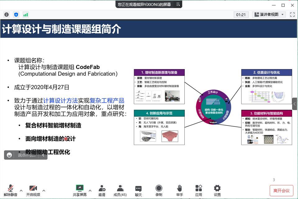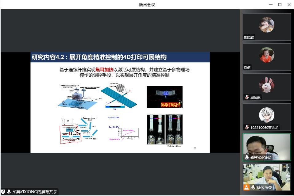 9月21日下午15:00,南方科技大学系统设计与智能制造学院副研究员熊异应重点实验室邀请,作了题为“面向连续纤维复合材料增材制造的结构与功能设计”的学术报告。报告采取线上会议的方式进行,材化学院相关专业的教师和学生代表参加了此次学术报告。