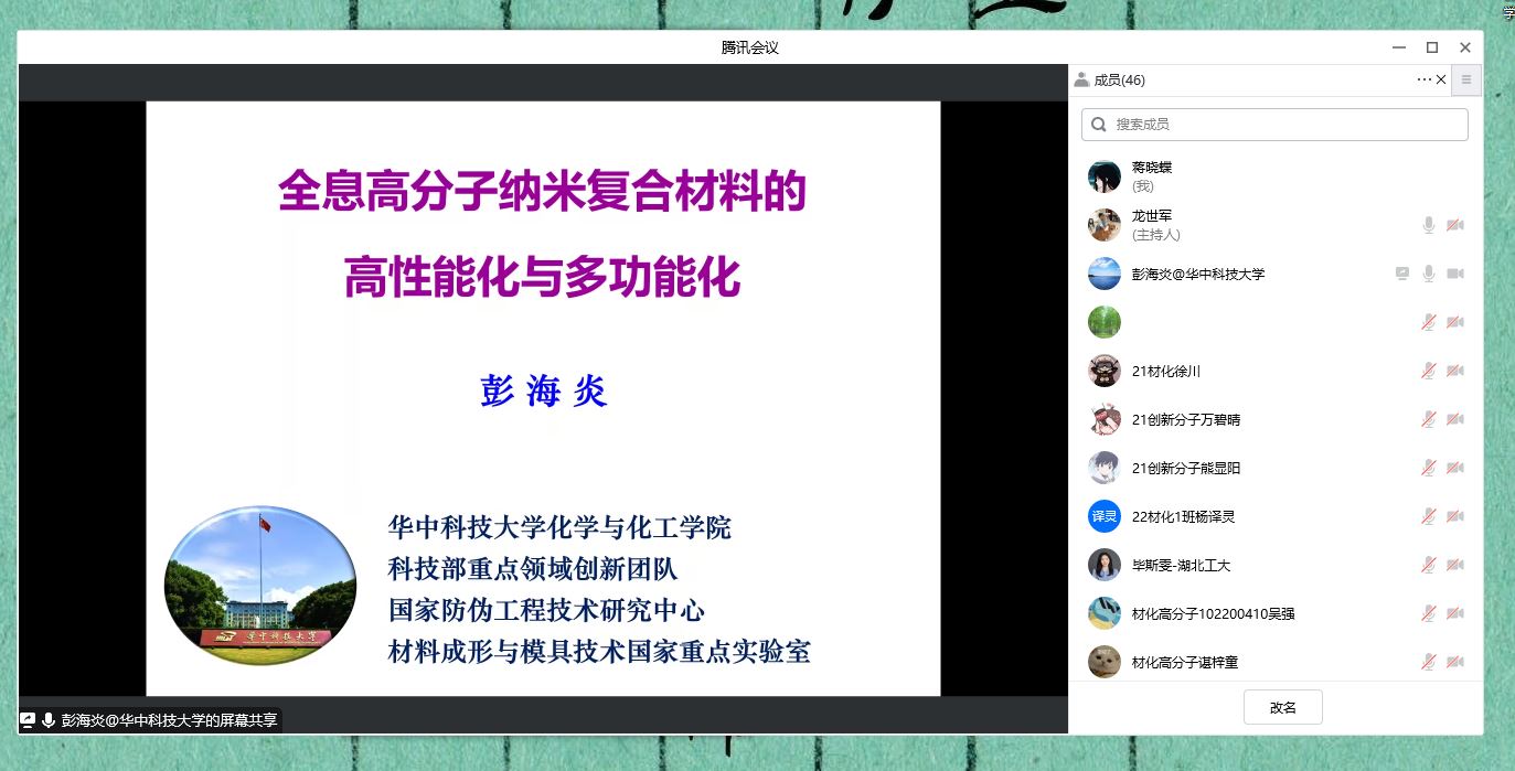 12 月 9日下午15:00,绿色轻工材料湖北省重点实验室邀请了彭海炎教授为学院师生作了题为“全息高分子纳米复合材料的高性能化与多功能化”的学术讲座。报告采取线上会议的方式进行,材化学院相关专业的教师和学生代表参加了此次学术报告。
