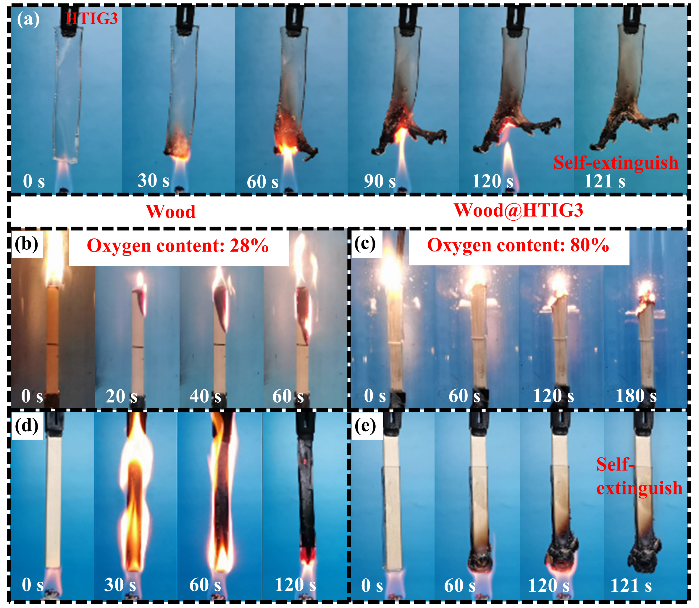 该离子水凝胶还具有优异的阻燃性能。离子水凝胶自身在酒精灯下灼烧120s,仍无法被引燃,离火马上自熄。此外,将离子水凝胶包覆于木材上,木材的阻燃性能也显著提升。即使在含氧量为80%的环境中,包覆了离子水凝胶的木材燃烧的速度和剧烈程度也远低于纯木材在28%氧含量下燃烧。在垂直燃烧产生中,离子水凝胶有效阻止火焰的蔓延,对木材起到良好的阻燃保护作用。