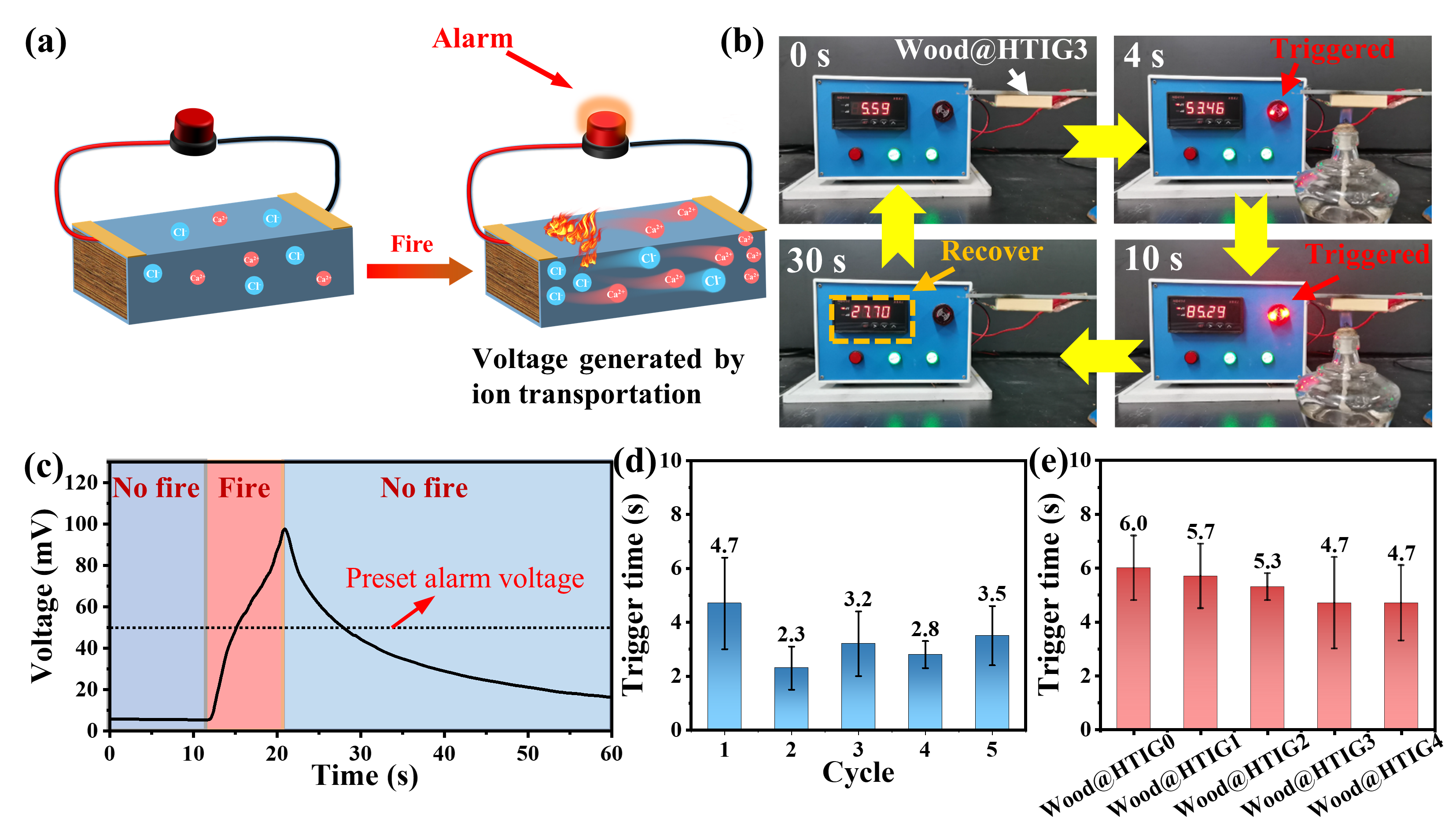 图4 智能防火离子水凝胶包覆木材的火灾预警性能(图片来源:Journal of Materials Chemistry A)