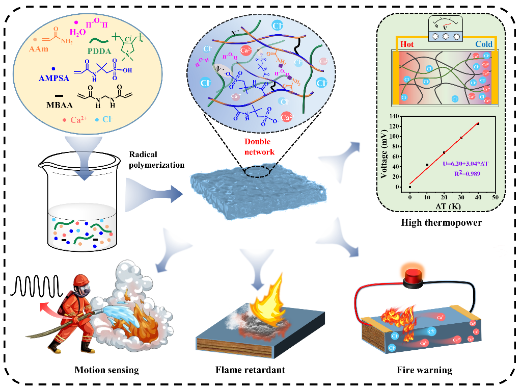 最近,华南理工大学赖学军教授和曾幸荣教授课题组在制备具有高热电势智能防火材料方面取得重要进展。这项工作以丙烯酰胺、2-丙烯酰胺-2-甲基丙磺酸、聚二烯丙基二甲基氯化铵、氯化钙和水等为原料,通过热引发自由基聚合制备了多功能高热电势阻燃离子水凝胶。由于离子水凝胶中的阴阳离子会在温度梯度作用下定向迁移,而阴阳离子的迁移速率不同,使得冷热两端堆积的阴阳离子比例不同,从而在冷热两端产生巨大的电势差。引入离子热电效应,使智能防火材料的热电势提高到3 mV/K,遇火时产生的报警信号超过100 mV,是之前报道的热电型智能防火材料的数十倍,并能在4秒左右触发报警系统。