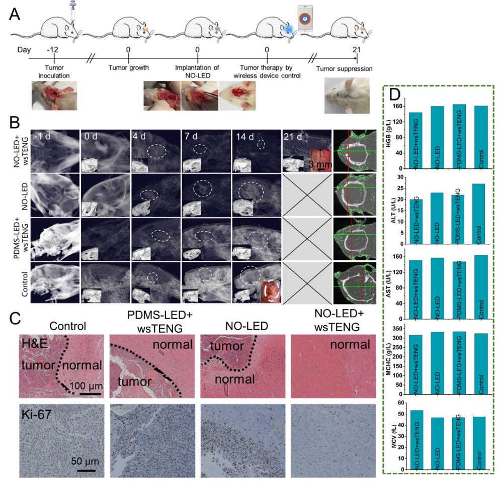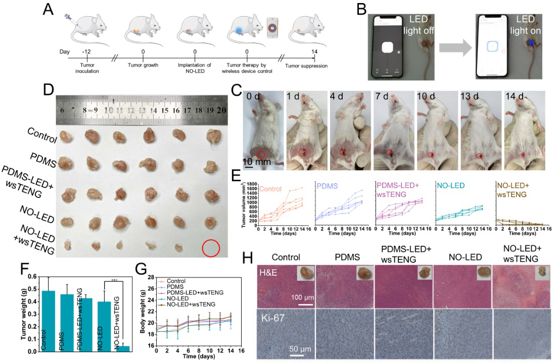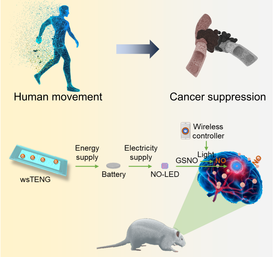 中科院北京纳米能源与系统研究所李琳琳研究员、王中林院士与首都医科大学宣武医院关云谦研究员团队合作,设计了一套用于颅内神经胶质瘤气体治疗的自供能治疗系统。这一系统由患者可以自我操控、可穿戴的、可拉伸的摩擦纳米发电机(wsTENG)和可颅内植入的一氧化氮(NO)释放器件(NO-LED)组成。wsTENG穿戴在患者身上(手臂、腿等部位),将身体运动机械能转化为电能,并启动植入颅内的NO释放器件,持续释放NO气体杀死肿瘤细胞。这一治疗过程可以由患者通过智能手机无线操控,具有可长期、远程、家庭化治疗应用的潜力。