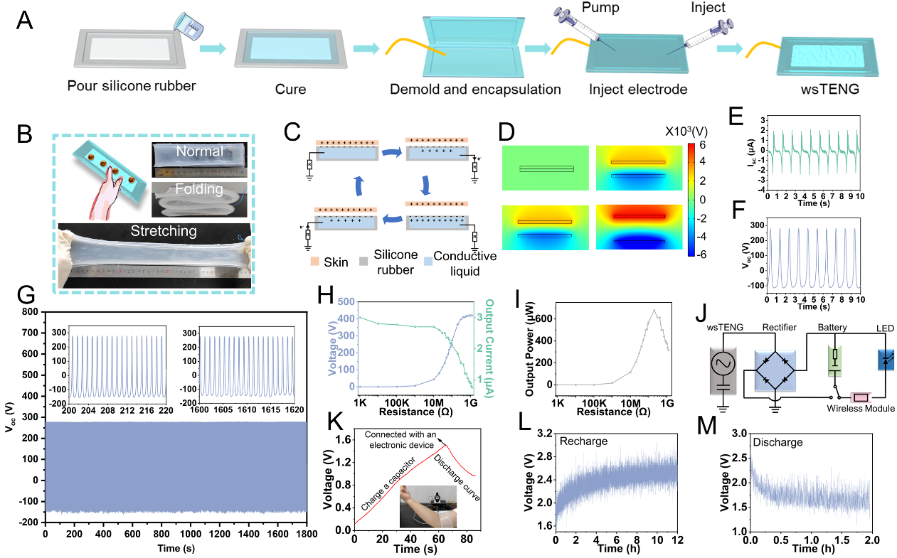 图一. 可穿戴和可拉伸单电极模式TENG(wsTENG)的制作、输出和能量收集性能