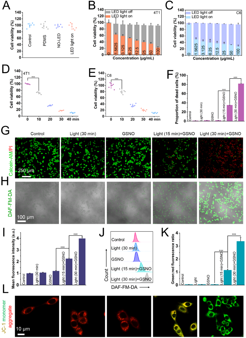 图三. 自供能气体治疗系统的体外癌症治疗效果