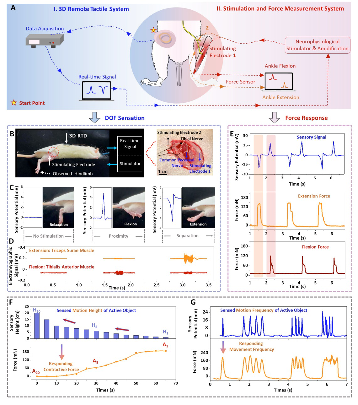 图3 人工3D遥感触觉系统(3D-RTS)集成到生物体神经肌肉系统中。