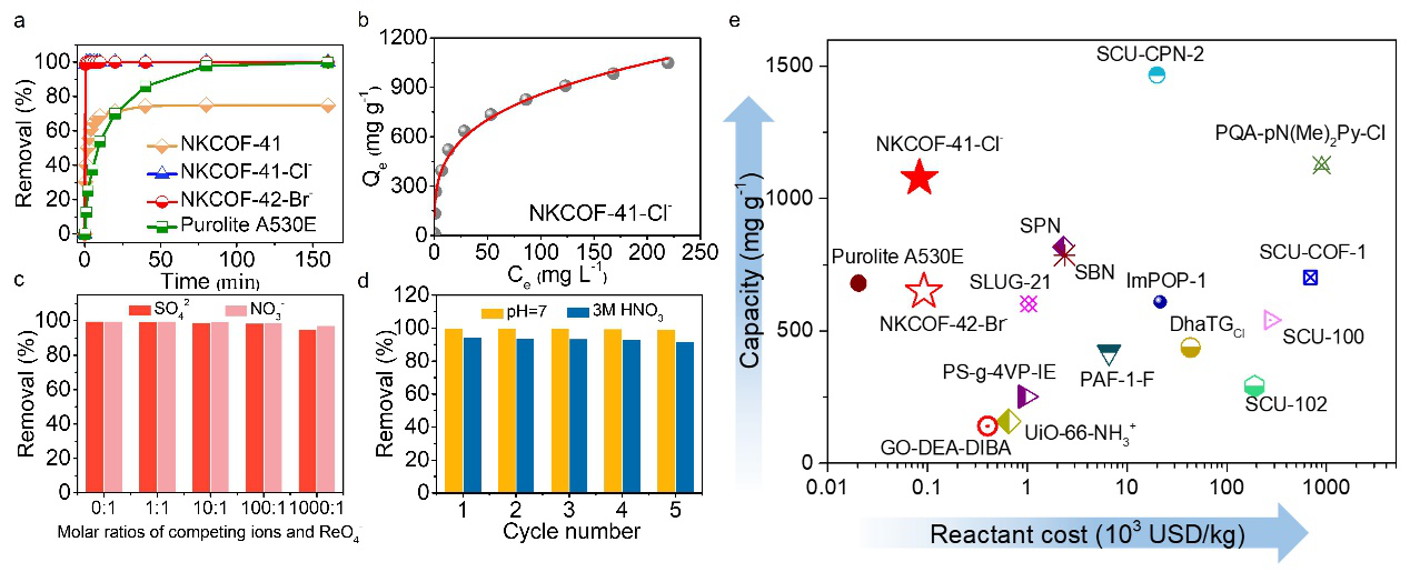 图3 (a) NKCOF–41等COF与商业离子交换树脂的Purolite A530E对ReO4–的吸附动力学;(b)NKCOF–41–Cl–对ReO4–的吸附等温线;(c)竞争阴离子对 SO42–和 NO3–去除ReO4–的影响;(d) NKCOF–41–Cl–在中性或3M HNO3水溶液中去除ReO4–的可回收性;(e) 吸附剂的吸附容量和反应物成本示意图。