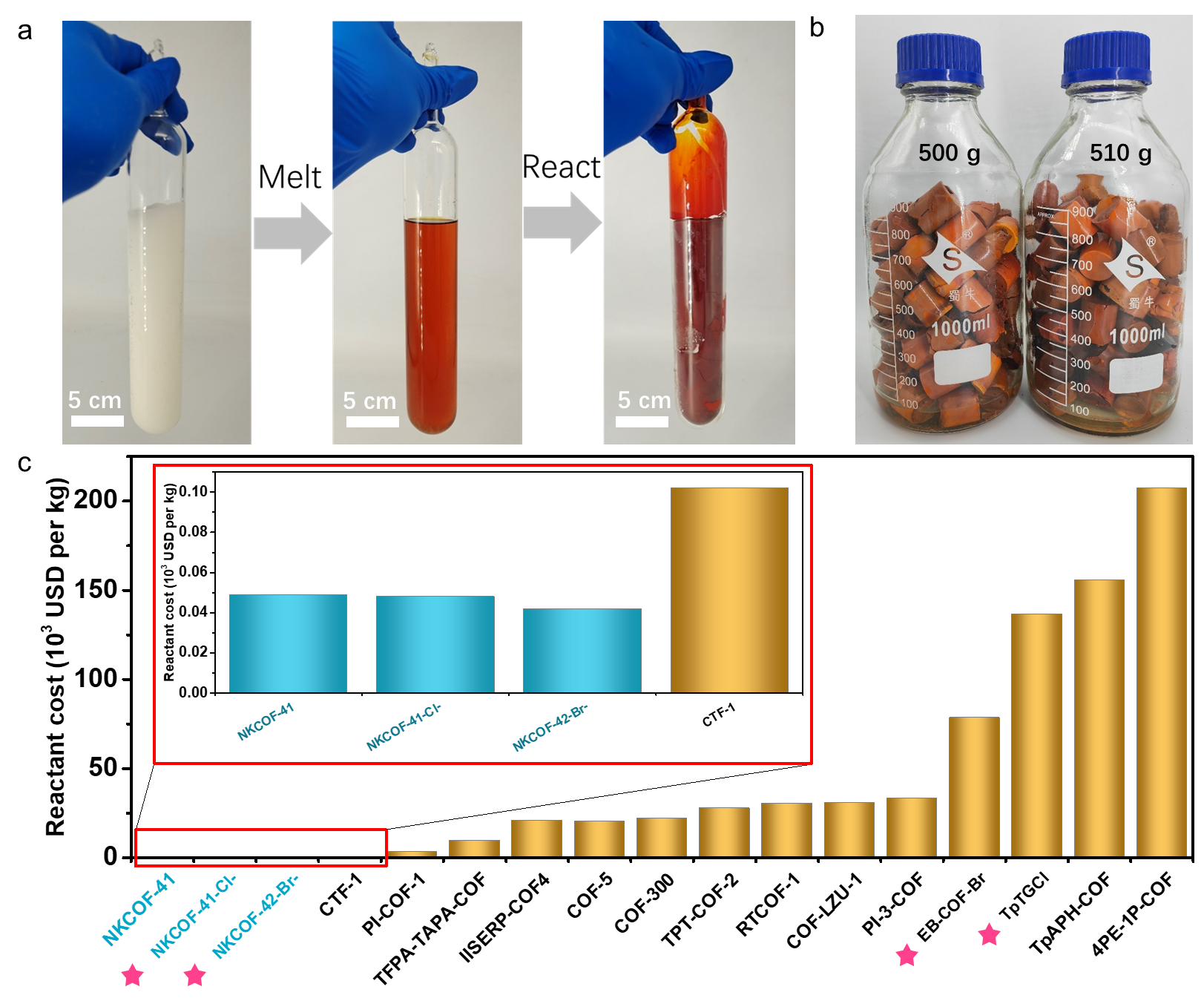 图2 (a) 一步合成百克级NKCOF–41示意图;(b) 千克级NKCOF–41的照片;(c) NKCOF–41、NKCOF–41–Cl–和NKCOF–42–Br–的反应物成本及与报道的廉价COFs的对比。