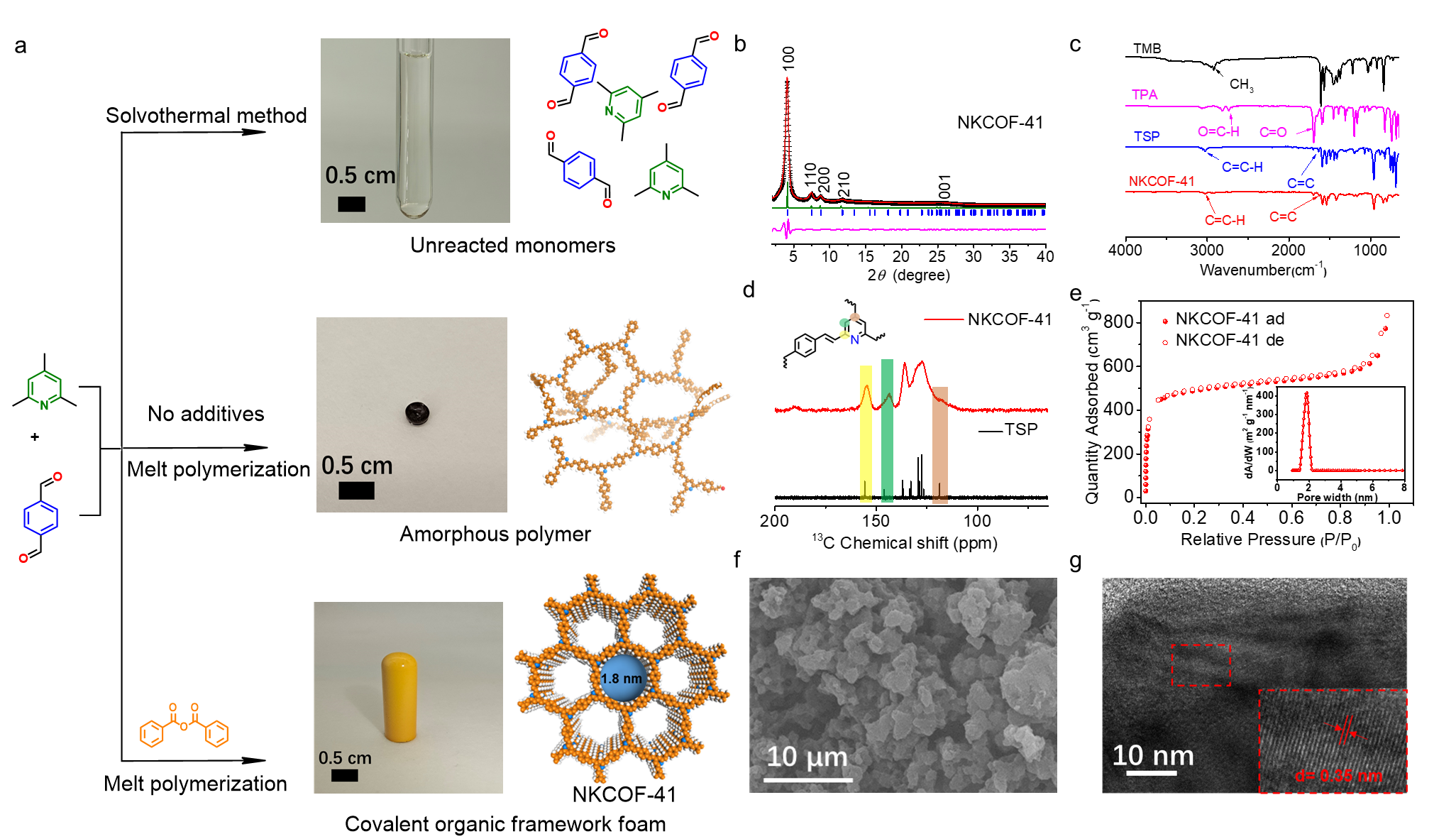 图1 (a) 构建基于可力丁的乙烯基COFs的示意图;(b) NKCOF–41 的X射线粉末衍射图;(c) 模型分子、NKCOF–41和相应单体的红外光谱;(d) NKCOF–41和模型分子的 13C NMR光谱;(e) NKCOF–41在77 K的N2吸脱附等温线;(f) NKCOF–41的扫描电子显微镜图像;(g) NKCOF–41的透射电子显微镜图像。