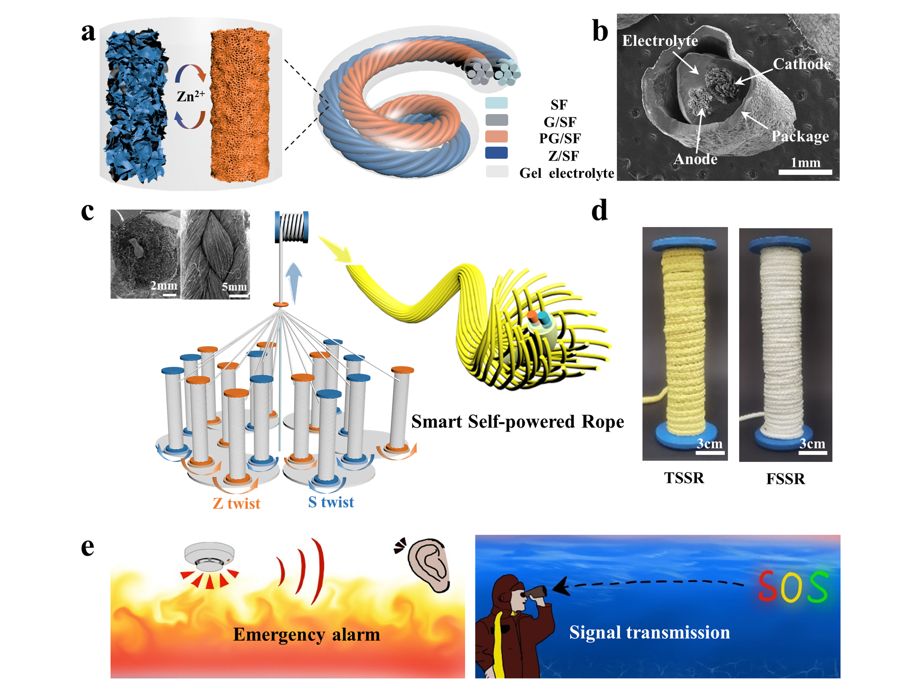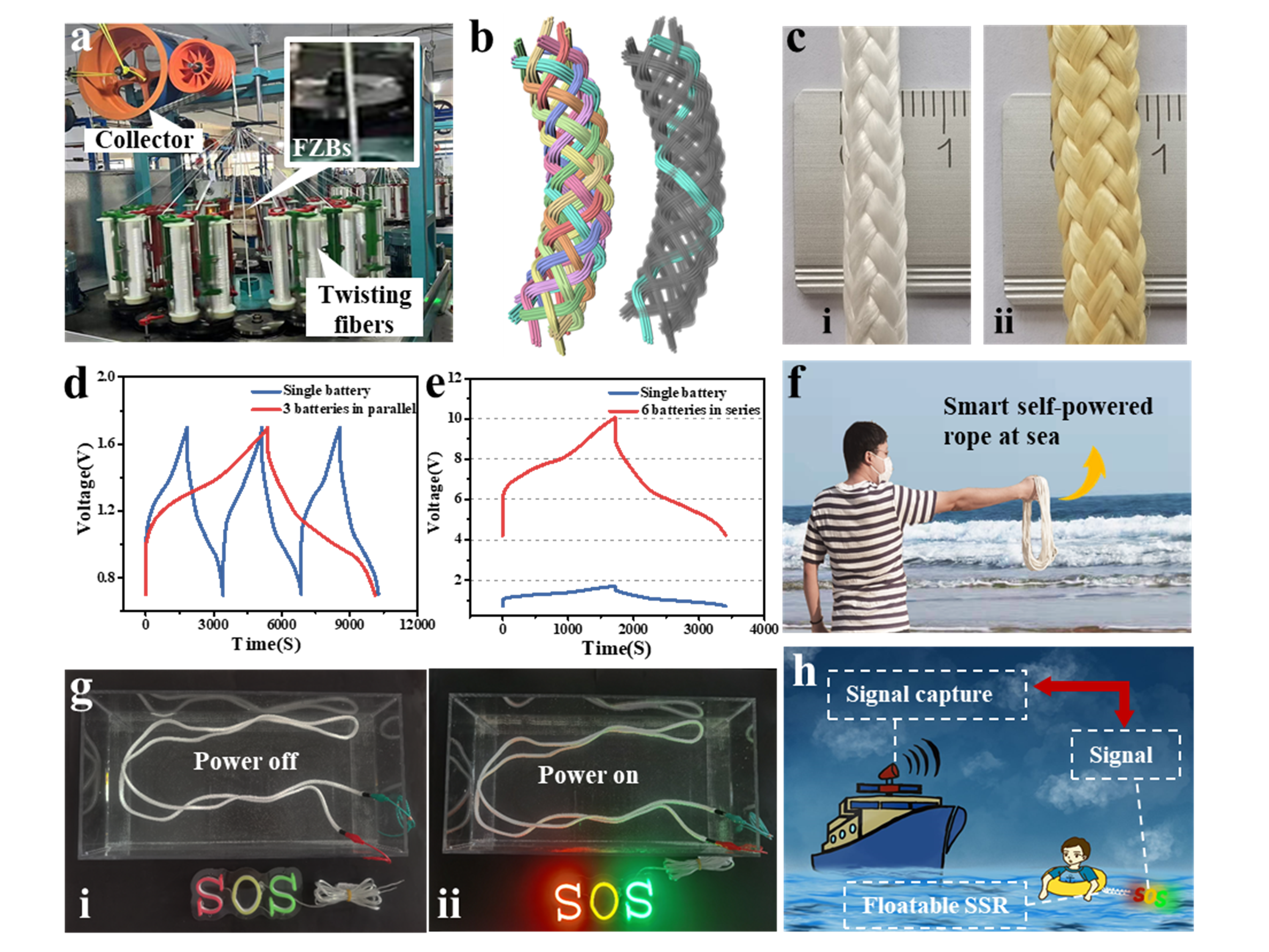 近日,青岛大学曲丽君教授/田伟明教授团队在《Adv. Funct. Mater.》上发表了题为“A Smart Self-Powered Rope for Water/Fire Rescue”的研究论文。作者基于经典的纺织编织技术,将纤维基锌离子电池与传统绳索单元相结合,开发出一种具有良好电化学性能的自供电一体化智能绳索,适用于水/火紧急救援(图1)。该项工作在极端环境下展示了可漂浮式自供电绳索和耐高温性自供电绳索的应用潜力。智能绳索在保持其原有力学性能的同时,也成功实现了救援活动中的智能主动响应,极大地缩短了救援时间,保护了人体的安全和健康。