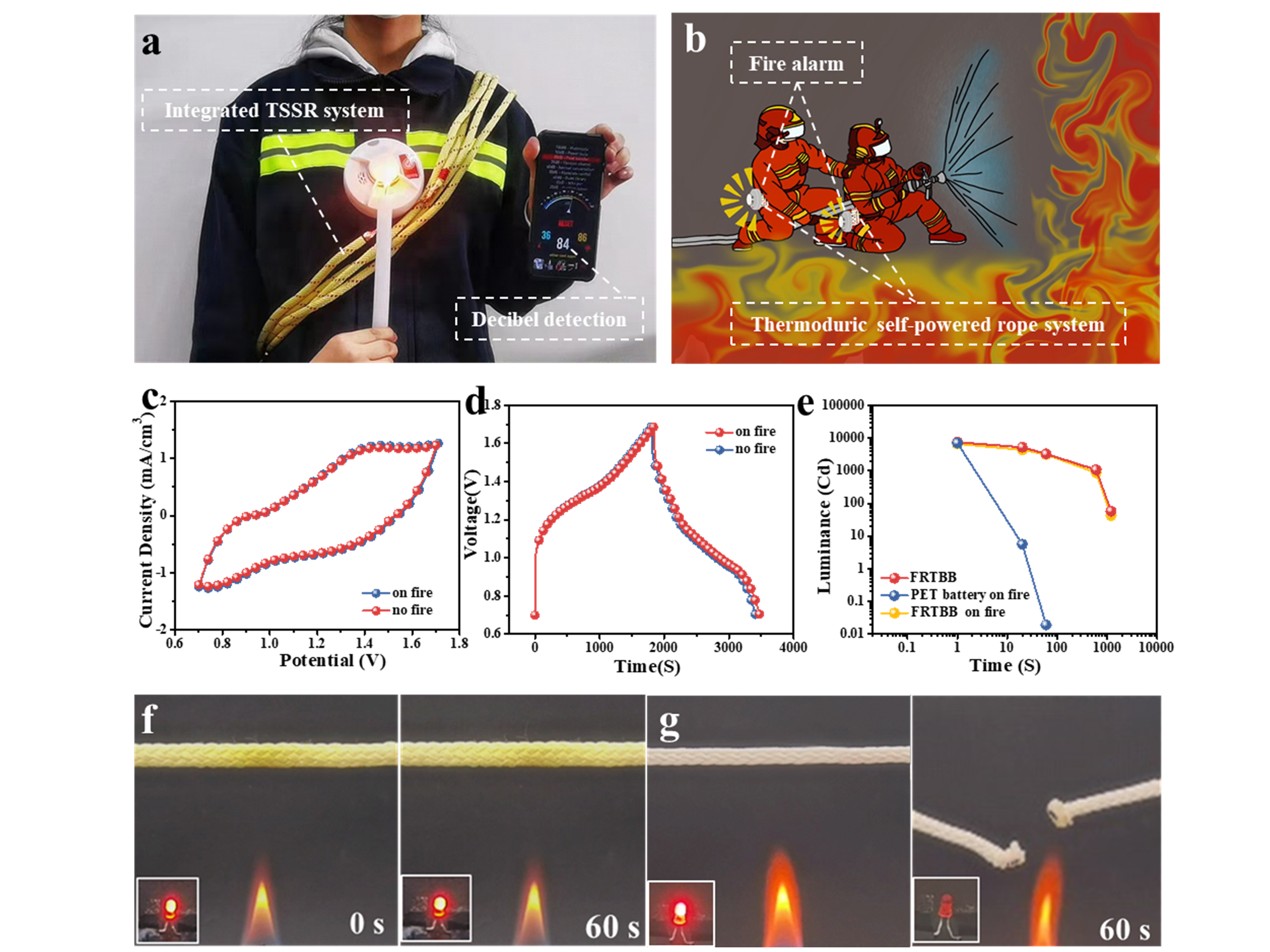 此外,作者通过选用芳香族聚酰胺纤维为编织纱,制备了耐高温性智能绳索,并可与高温报警器相结合,构筑了智能穿戴式火灾报警系统集成了灵活的结构可设计性。该火灾报警装置可利用耐高温性智能绳索来进行有效供电,进一步监测温度变化,当处于高温环境时发出高达84分贝的警鸣。在此基础上,当消防员暴露在极端的火灾环境中时,集成系统可以提醒他们已身处高温环境。实时火灾预警同时也实现了精确定位,这将有助于救援人员在火灾中搜索和救援被困人员(图3a-b)。通过在高温环境下测量智能绳索的电化学性能和热稳定性,证明了耐高温性智能绳索可以在高温下保持正常的充放电过程,其比容量在火焰下基本保持不变,并可在20 min的高温下依然保持有效供电(图3c-g)。这些结果表明,具有稳定储能性能和耐高温性的智能绳索在可穿戴式火灾报警装置具有良好的应用潜力。