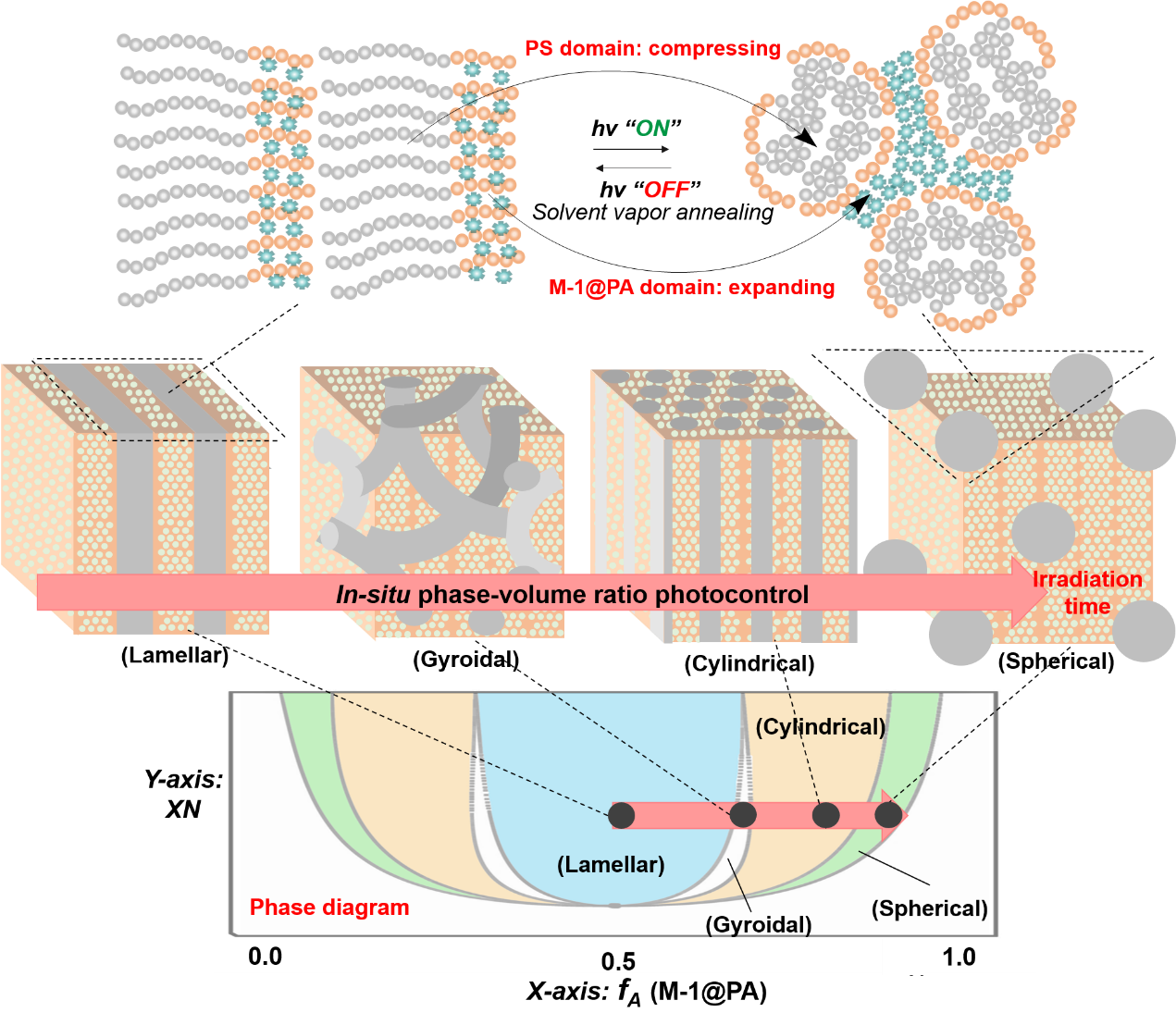近日,上海理工大学的青年教师岳兵兵和复旦大学的朱亮亮教授合作,提出了一种远离平衡的动力学策略,通过原位相体积率的光控能力,以精确实现跨相图的微相分离结构原位操控。研究者们设计了一种超分子嵌段共聚物作为微相可分离的模型,它涉及一种非共价键合的构象可变分子(多硫芳烃),其基态和激发态之间具有明显的构象差异。相对于基态构象,激发态构象可以在辐照时驱动分子的自组装,其程度与辐照时间有关。这导致了连续的相演化,并成为原位相体积率变化的前提。在此基础上,多硫芳烃的激发态构象变化进一步驱动用于调节微相分离自组装的聚合物链段,导致一个相区扩展,另一个相区压缩。通过优化,在不同的辐照周期下,实现了微相分离结构在相图上的渐进转换,从层状相到双连续相,再到圆柱相,最后到球相。