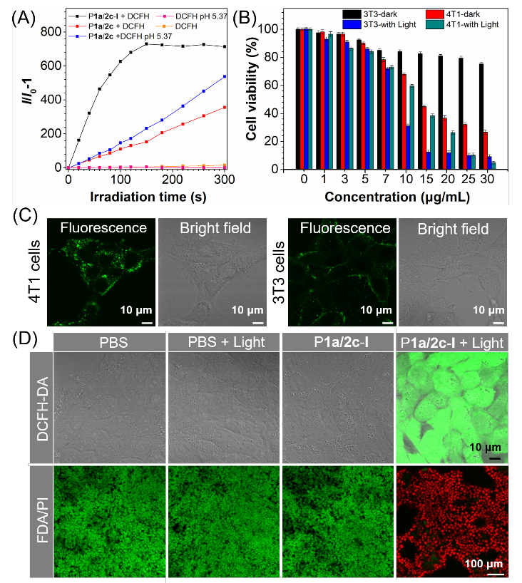 (4)所获得的芳杂环聚合物可以通过简单的N-甲基化反应被转化为多种新型荧光共轭聚电解质。这些聚电解质能够通过暗毒性和光毒性的协同作用对癌细胞进行高效杀伤,该性质进一步扩展了稠杂环聚合物在光动力癌症治疗中的应用范围(图6)。