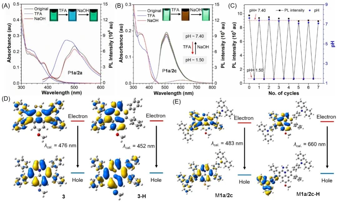 图4 聚合物的酸碱响应型荧光性质及相关理论模拟计算。