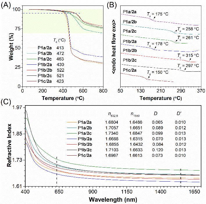 (2)所获得的新型含氮芳杂族聚合物具有优异的热稳定性和形貌稳定性、良好的溶解性、高折射率和低色散性能,,使其有潜力作为新型耐高温光学涂层用于先进光学器件的制备当中。在失重5% (Td)时,这些聚合物的热分解温度值可达到最高可达522 ℃ ,并且在高达800℃时依然可以保持70%以上的含碳量,玻璃化转变温度最高可达315℃(图2)。