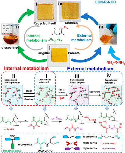 近期,上海交通大学化学化工学院史子兴等设计合成了一种烯酮胺结构的小分子,并以其作为动态交联剂制备了动态交联的聚氨酯材料。烯胺酮与异氰酸酯反应形成烯胺酰胺在高温条件下解离为烯酮胺和异氰酸酯,实现了聚氨酯的回收,这一过程被定义为“内循环”。进一步地,基于胺基与异氰酸酯之间的优先反应,胺类化学物可以用作“剪刀”来切割交联点,将交联聚合物转变为可聚合的大分子单体,参与新型交联聚氨酯的制备,实现了聚合物 “新陈代谢”和“成长”,这一过程被定义为“外循环”。这类含烯酮胺结构的动态交联剂可以替换传统交联剂,有利于动态交联聚氨酯的工业化应用。