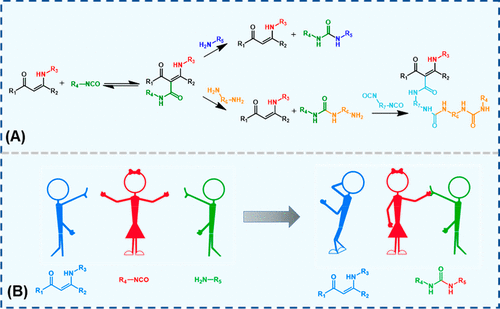 图 2 (A) 胺、烯胺酮和异氰酸酯之间的化学反应 (B) 胺、烯胺酮和异氰酸酯之间的竞争反应示意图