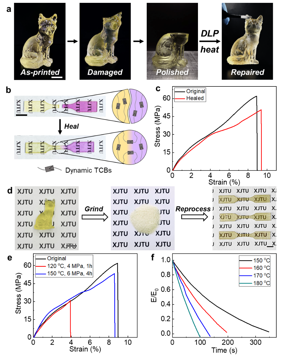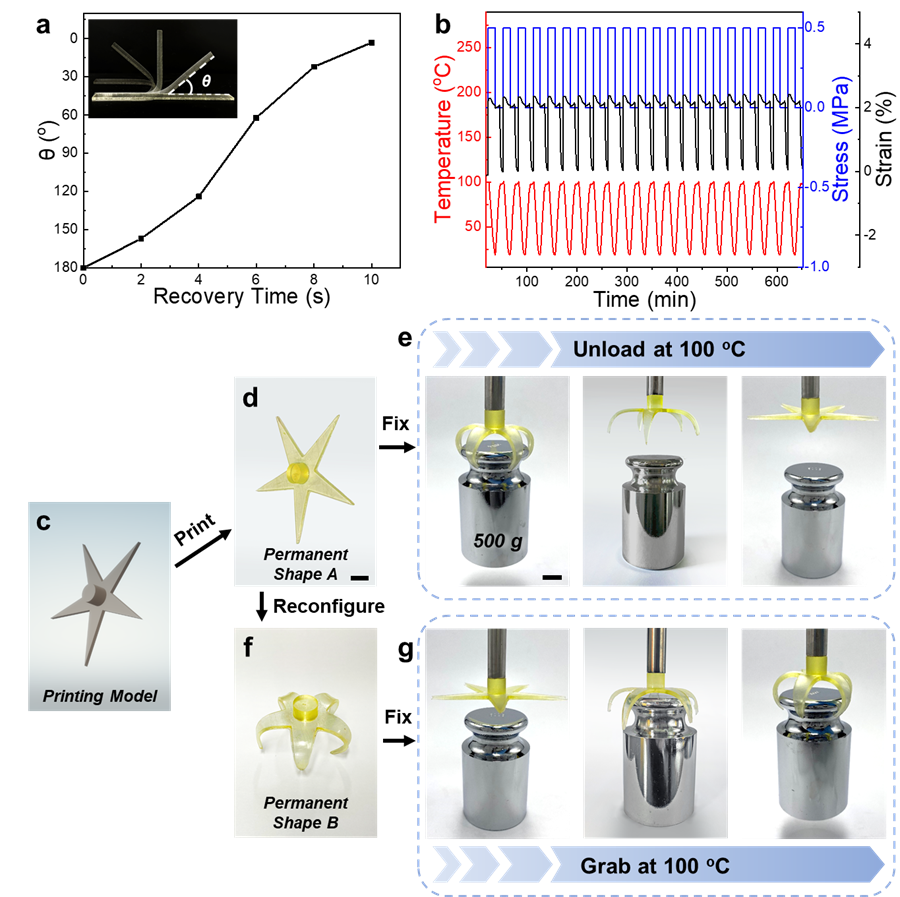 4D打印因其在智能设备、生物医学和组织工程中的潜在应用而引起了科研以及工业领域的极大兴趣。其中,形状记忆聚合物由于其形变大、重量轻、恢复应力大、响应速度快等优点,在4D打印材料中至关重要。然而,4D打印形状记忆聚合物通常是由共价交联的网络组成,不变的永久形状导致其形状恢复方向单一,限制了4D打印的灵活性。此外,虽然光固化3D打印具有更高的精度、分辨率和表面质量,但目前光固化3D打印的形状记忆聚合物结构由于其不溶解和不熔化的共价交联网络,所得的打印结构不可回收、不可修复,从而造成严重的经济和环境问题。因此,开发用于4D打印的高强度、可多次重构、可回收和可自愈的材料至关重要。