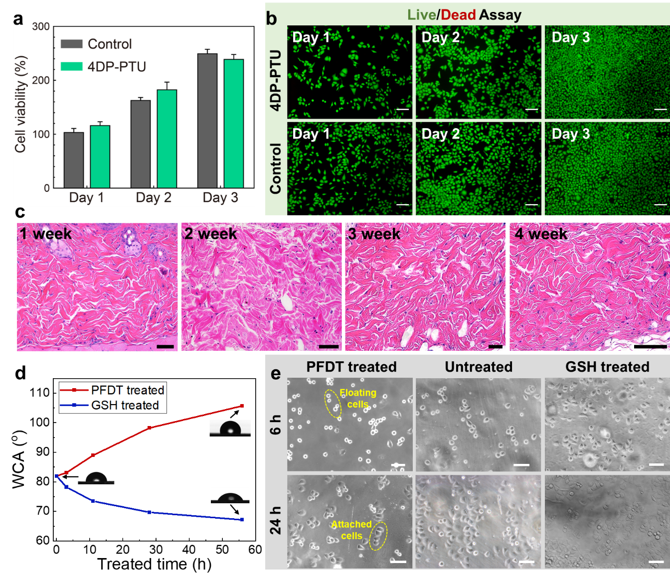 图5. 4DP-PTU的生物相容性和其表面改性。
