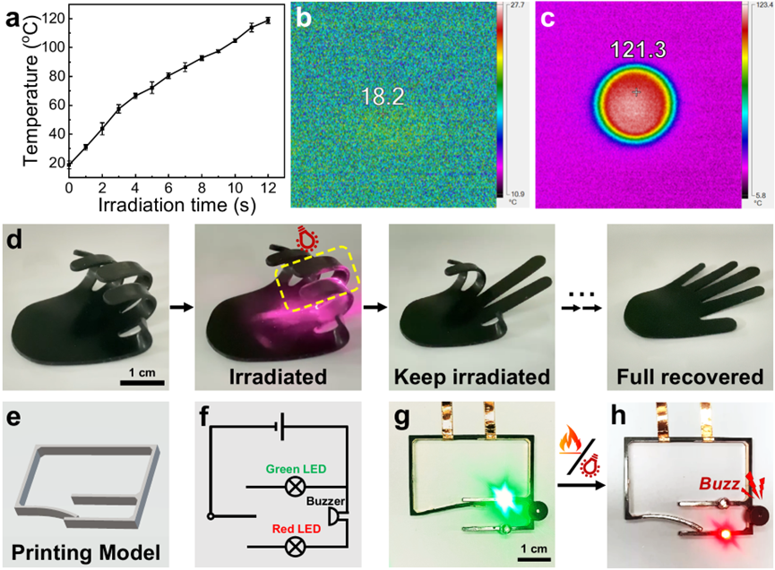 4DP-PTU中加入碳纳米管制备得到复合材料4DP-PTU/CNT,可实现近红外光(NIR)触发的精确区域化形状控制。在近红外激光的辐射下,4DP-PTU/CNT发生光热转化,表面温度在12秒内从室温上升到超过120 ℃。用4DP-PTU/CNT打印的手掌形状可按需变形证明了光控形状记忆的精确性。基于热和光的双重响应性,由4DP-PTU/CNT制备的报警器,可在发生异常高温与红外光暴露时报警,证明了其在智能警报器方面的潜在应用。