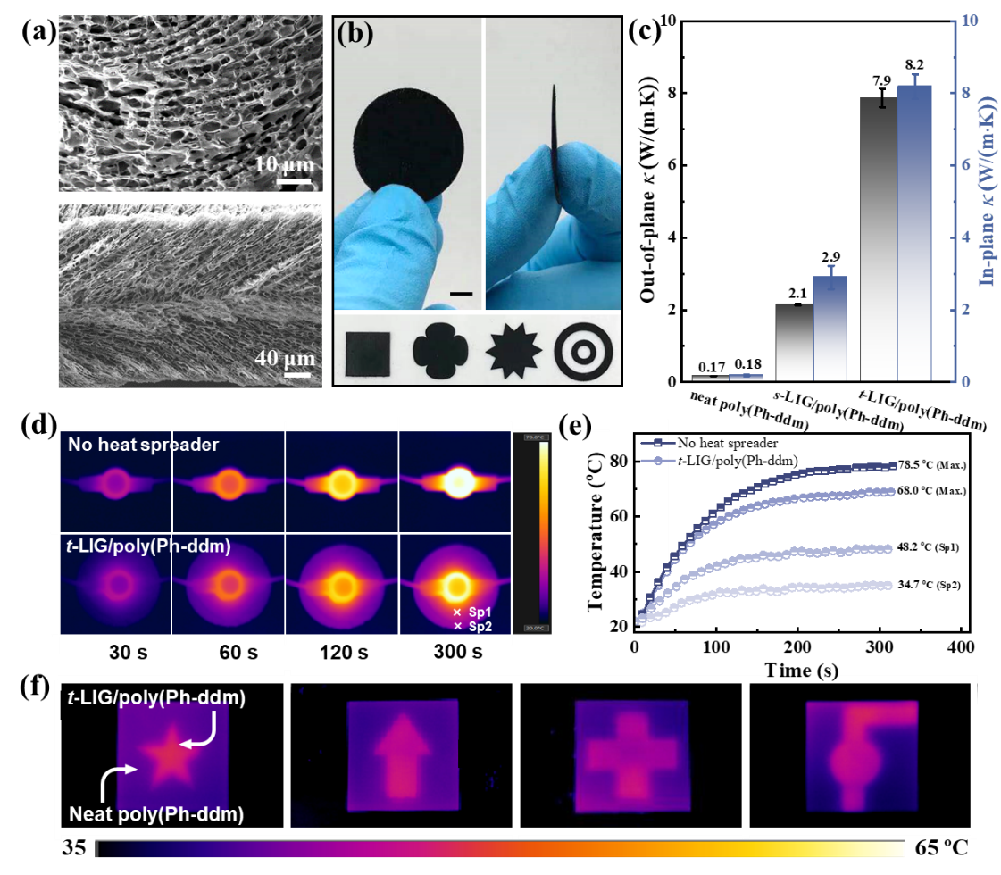 近日,借助激光扫描路径可控的优势,该团队设计制备了图案化多孔石墨烯并探究了其在热管理领域的应用。研究表明,通过二次激光处理,石墨烯的质量大幅度提高,同时多孔结构得以保留。填充树脂后,所制备复合材料的导热系数可以达到8.2 W/(m·K),与纯树脂相比提高了近45倍。不仅如此,通过图案化设计,复合材料的热量传递具有明显的方向性,并且展现出良好的散热效果。与其它图案化石墨烯制备方式相比,激光雕刻技术具有明显的优势。