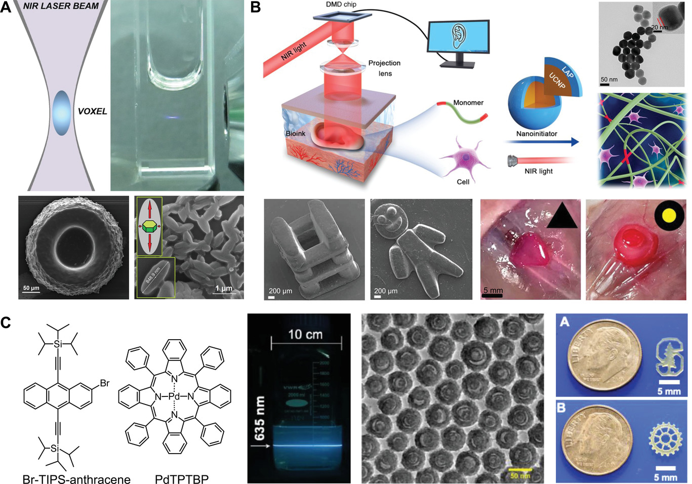 图2. 上转换纳米粒子用于3D打印。A) NaYF4无机上转换纳米粒子打印效果; B) 光引发剂负载上转换纳米粒子用于活体3D打印;C)三重态湮灭上转换纳米胶囊用于高精度3D打印