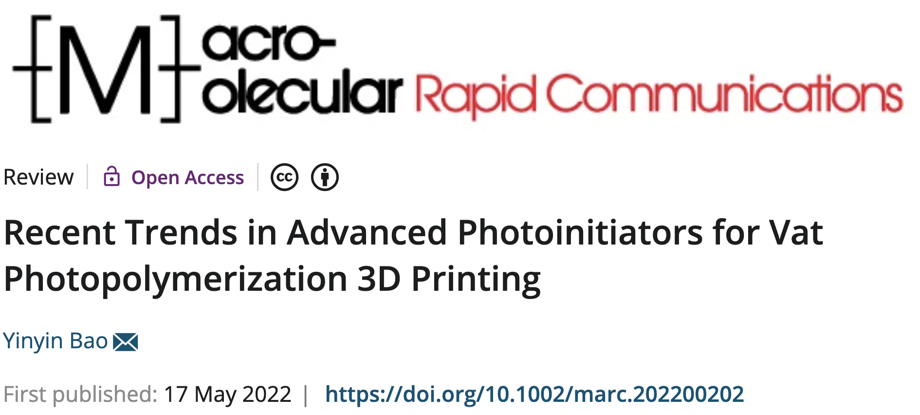 近日,苏黎世联邦理工学院药学系鲍寅寅研究员着重梳理了用于光聚合3D打印的光引发剂以光引发体系在近年来开发与应用的研究趋势,涉及了小分子、高分子以及纳米组装体等不同种类的引发剂体系。作者随后分析了目前该领域的研究现状与不足,并对改进的策略与未来的研究方向提出了自己的见解。该综述作为邀请论文发表于Macromolecular Rapid Communication杂志并可开放获取。