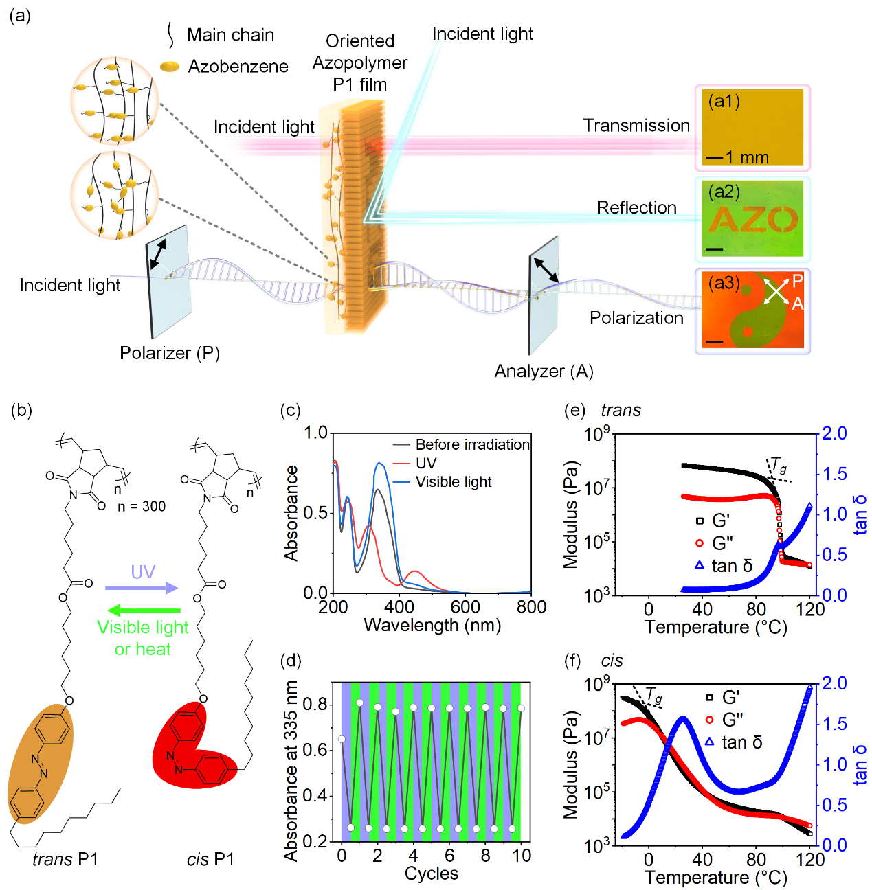 图1. (a) 在透射(a1)、反射(a2)和偏振(a3)模式下观察的图案化的偶氮聚合物P1的示意图和照片。(b) P1的化学结构和顺反式光异构化。(c) P1旋涂薄膜光照前、紫外光照后,以及可见光照后的紫外-可见吸收光谱。(d) 紫外和可见光交替照射10个周期后的紫外-可见吸收光谱变化。(e)、(f) 反式P1和顺式P1流变学测试。Copyright Wiley-VCH Verlag GmbH & Co. KGaA, Weinheim.