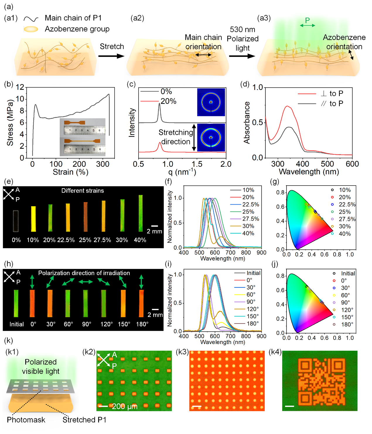 图3. P1薄膜的色偏振图案制备过程。(a) 高分子主链的拉伸取向和侧链的光致取向示意图。(b) P1应力应变曲线。(c) 0%和20%应变的P1的SAXS谱。(d) 530 nm偏振光照射20%应变的P1薄膜的偏振紫外-可见吸收光谱。(e-g) 正交偏振片之间不同应变的P1薄膜照片, 透射光谱和CIE-1931色度图。(h-j) 20%拉伸P1薄膜在530 nm偏振光照射之前和之后的照片,透射光谱和CIE-1931色度图。(k) 制备色偏振图案的示意图和偏光显微镜(POM)图像。Copyright Wiley-VCH Verlag GmbH & Co. KGaA, Weinheim.