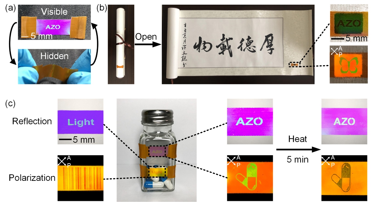 与单模式图案相比,双模式图案具有更高的防伪安全性。光子晶体结构色可以通过弯曲实现可见和隐藏之间的切换(图5a)。吴思团队展示了双模式的P1薄膜在书法卷轴的防伪应用(图5b)。此外,由于在高温下聚合物主链会发生松弛,导致色偏振颜色变化,这种热响应特性可以作为高温不稳定药物的指示标签(图5c)。