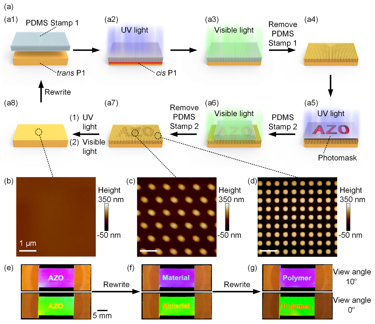 正交图案化技术的第一步是制备图案化的光子结构。首先,将具有四方阵列纳米孔的PDMS模板1放置在一个平整的自支撑反式偶氮苯高分子P1薄膜之上,使用365 nm的紫外光诱导固液转变,顺式的液体高分子自发的被吸入PDMS的孔洞中。然后,使用530 nm的可见光诱导高分子固化,取下PDMS后形成光子结构。为了制备图案,通过“AZO”光掩膜施加紫外光,照射后的“AZO”区域变为液体,随后,使用另一个具有六方阵列的椭圆纳米孔的PDMS模板2紧贴在P1上,再使用530 nm的可见光诱导P1固化,并取下PDMS模板2(图2a)。由于两种阵列具有不同周期(图2c,d),在相同角度的观察角下呈现不同的结构色(图2e)。此外,光子结构可以通过光致固液转变进行擦除(图2b),并重写为“Material”和“Polymer”(图2f,g)。