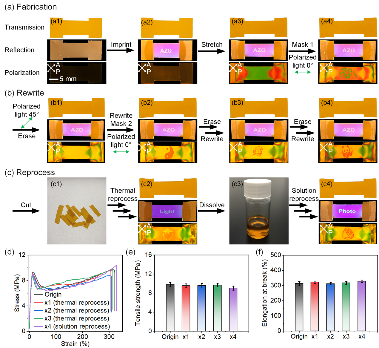 经过上述两种方法的设计,吴思团队成功制作了无干涉双模式图案。在P1薄膜上首先进行光纳米压印制备了光子晶体结构,再将薄膜拉伸、通过掩膜施加530 nm偏振光照,成功实现了无干扰双模式图案化(图4a)。由于偏振光只会改变偶氮苯的取向,不会改变光子结构,色偏振图案可以单独通过偏振光进行擦除和重写(图4b)。P1还可以通过热加工或溶液加工进行重塑(图4c)。重塑后的P1薄膜力学性能没有发生明显改变(图4d-e)。