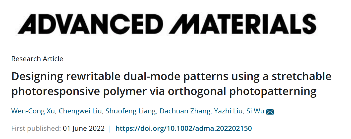 近日,中科大吴思教授团队设计了新型可拉伸的光致固液转变偶氮苯高分子,发展了正交光图案化技术在该高分子上制备了无干扰的双模式图案。该成果以Designing rewritable dual-mode patterns using a stretchable photoresponsive polymer via orthogonal photopatterning为题目发表在Advanced Materials上。吴思教授是该论文的唯一通讯作者,中科大为第一通讯单位。