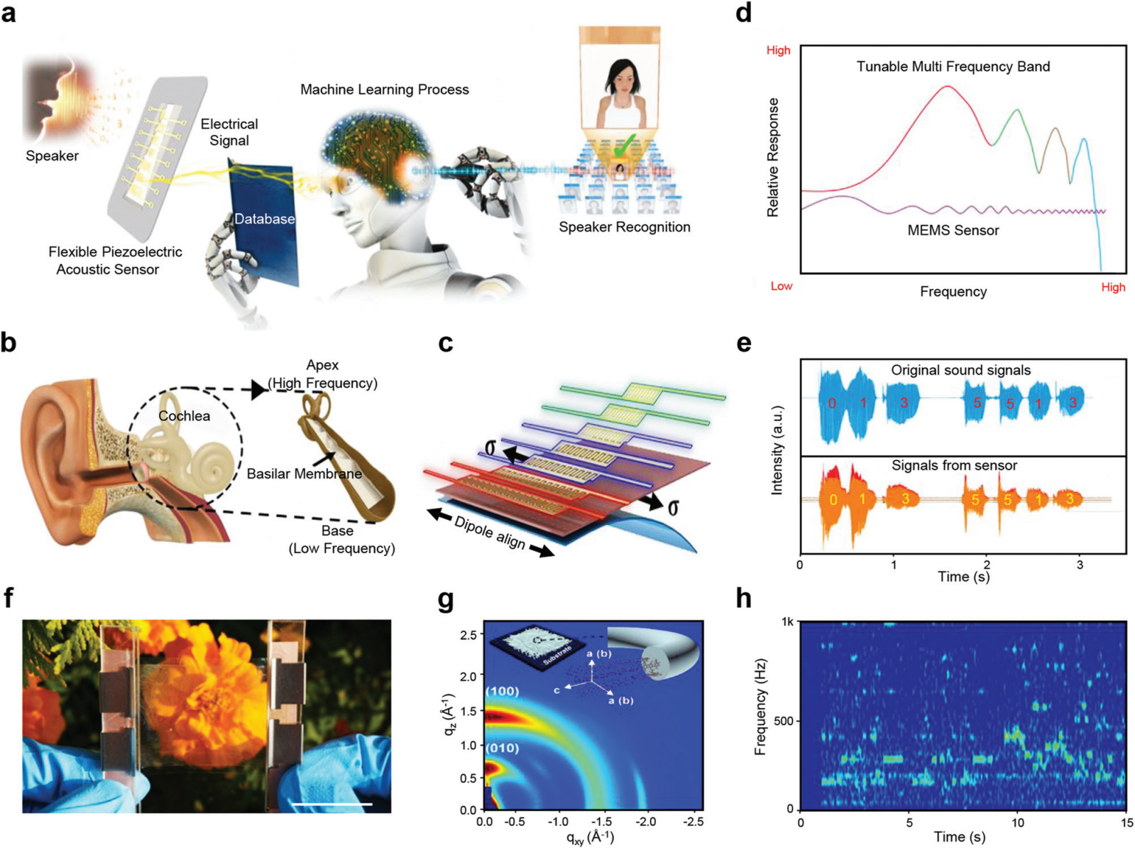 图 18 用于辅助物理治疗的 PENG。 (a) 基于机器学习的说话人识别系统的总体示意图。(b) 受基底膜启发的柔性压电声学传感器的示意图。(c) 受基底膜共振结构启发的微型 PMAS 的仿生多频带控制和移动生物特征认证的示意图。(d) 从多通道中选择的语音频带上产生的最高电信号的示意图。(e) 多通道柔性压电声学传感器记录的标准化女性语音的声音信号和相应的信号。 (f) 夹在两个 Ag NWs 电极之间的透明几丁质扬声器的数码照片。比例尺,3 厘米。(g) 硅衬底上几丁质薄膜的晶体图案。(h) 透明几丁质扬声器的短时傅里叶变换频谱图。