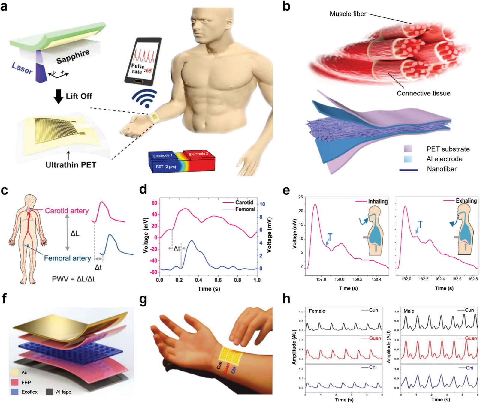 图 11 用于生命体征传感的 PENG。 (a) 基于 PZT 薄膜的自供电压力传感器的制造过程示意图。( b )由结缔组织增强的肌肉纤维和制成的肌肉纤维启发压电纺织品的示意图。(c) PWV 计算示意图。(d) 用于 PWV 计算的颈股动脉脉搏波形。(e) 深呼吸过程中吸气和呼气期间的肱动脉脉搏波形。(f) 使用 FEP/Ecoflex/FEP 夹层结构压电驻极体薄膜的脉冲传感装置示意图。(g) 模拟真实医生的传统中医脉搏采集方案,使用三指与脉搏感应系统在寸、关、尺位置。(h) 分别为女性和男性志愿者在寸、关和池位置测量的典型脉搏波形。