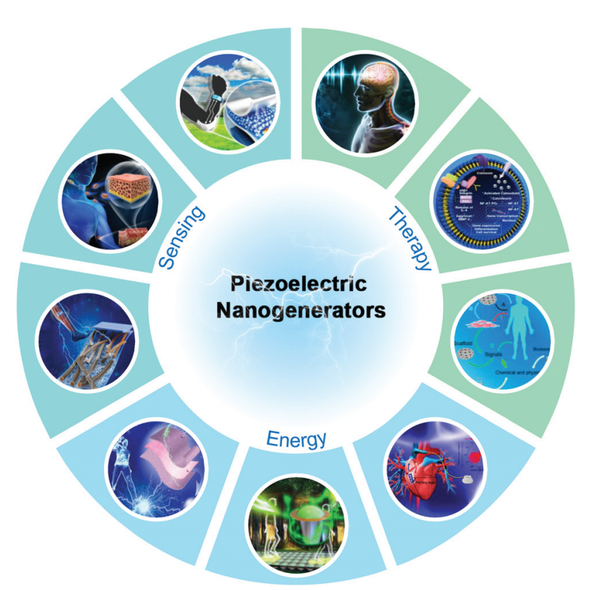 有几种技术可以将这些生物力学能转化为电能,包括但不限于压电效应(PENGs),摩擦电效应(TENG),磁弹性效应(MEG),和电磁效应。其中,基于压电效应的压电纳米发电机(PENGs)自 2006年发明以来,因其固有的特性而备受关注。作为压电材料,PENGs具有简单的工程结构,可以实现机械能和电能的可逆转换,实现高效的机电耦合、快速响应。PENG 不仅可以作为能量收集器,还可以提供主动传感能力,包括触觉传感、应力或应变传感、声学传感等形式。当附着在人体上时,PENGs 可以监测人体活动的微弱生理信号,包括脉搏检测、呼吸监测、组织弹性模量计算、血流监测等。除了这些应用之外,产生的电力还广泛用于原位电刺激、细胞活性调节、组织再生和药物输送。近年来,随着新材料的出现随着新加工技术的发展,PENG技术发展迅速,在能源、传感和治疗领域取得了重大进展。