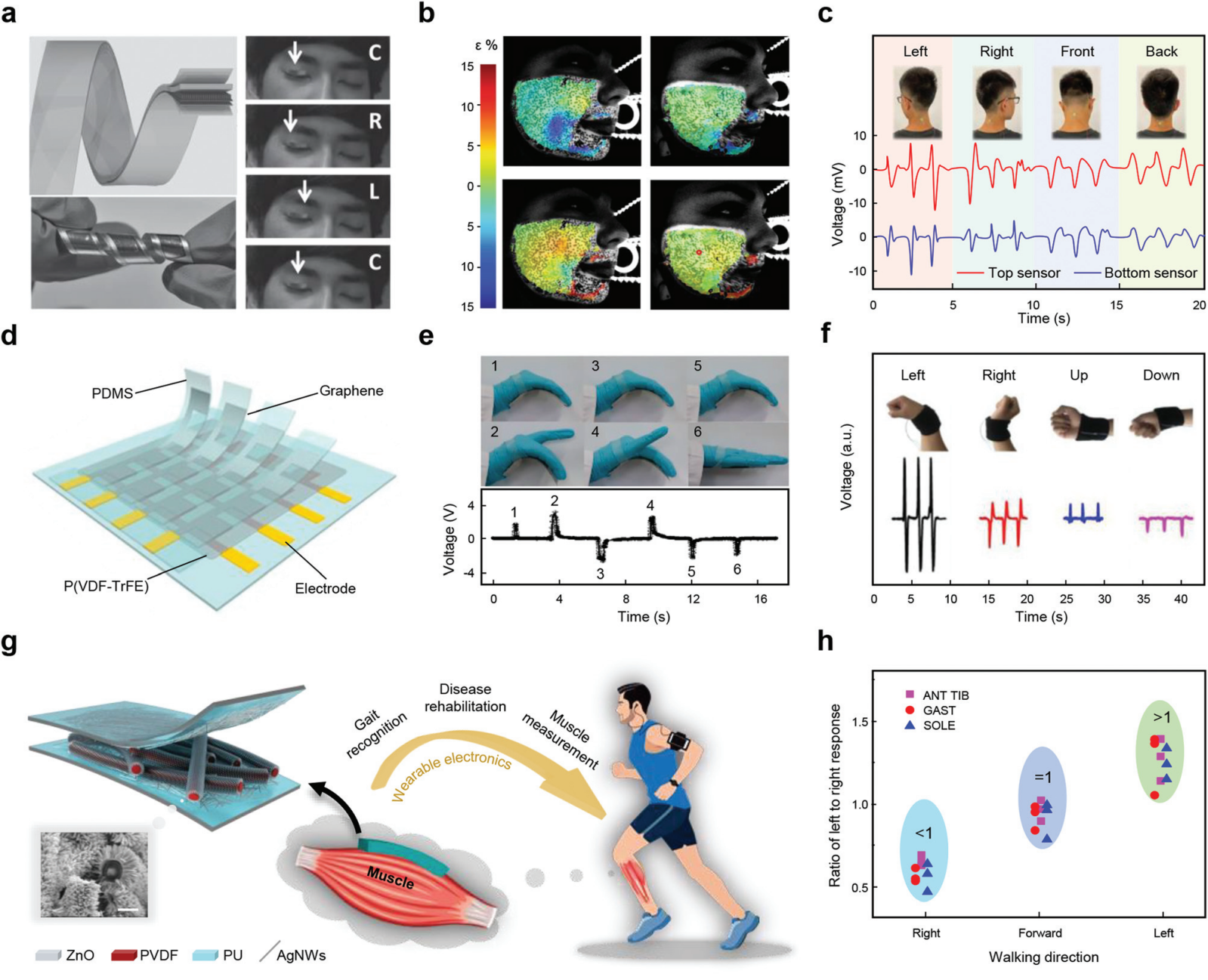 图 9 用于人体运动感应的 PENG。(a) 超薄纳米发电机作为追踪眼球运动的自供电皮肤传感器。(b) 在参与者进行面部动作(例如右脸颊抽搐)时分析皮肤应变。左侧的图像显示应变图作为人类参与者使用传感器(左)和不使用传感器(右)的结果示例,显示最小主应变(顶部)和最大主应变(底部)。(c) 基于压电陶瓷剪纸的颈部运动产生的电信号的实验结果。(d) 多级感觉矩阵的示意图。(e) 附在手掌上的四列多传感器的照片图像,用于捕捉手弯曲和手指抬起的运动(上图)和相应的传感信号(下图)。(f) 智能腕带在各种手腕运动下的输出信号。(g) 用于肌肉行为监测的三维分级联锁 PVDF/ZnO 纤维基 PENG 示意图。比例尺,1 μm。(h) 不同步行方向的小腿反应幅度(右腿)与另一条小腿反应幅度(左腿)的比值。