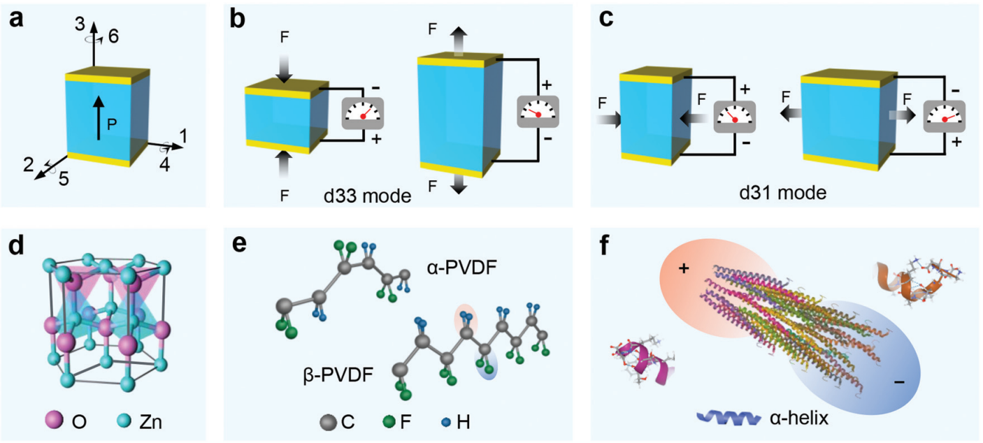 图 2:压电材料和压电性。 (a) 影响压电元件的力的方向。d33 (b) 和 d31 (c) 工作模式示意图。(d)无机压电材料ZnO的纤锌矿结构模型。(e) 有机压电聚合物 PVDF 的 α 相和 β 相结构。(f) M13 噬菌体的天然压电材料。