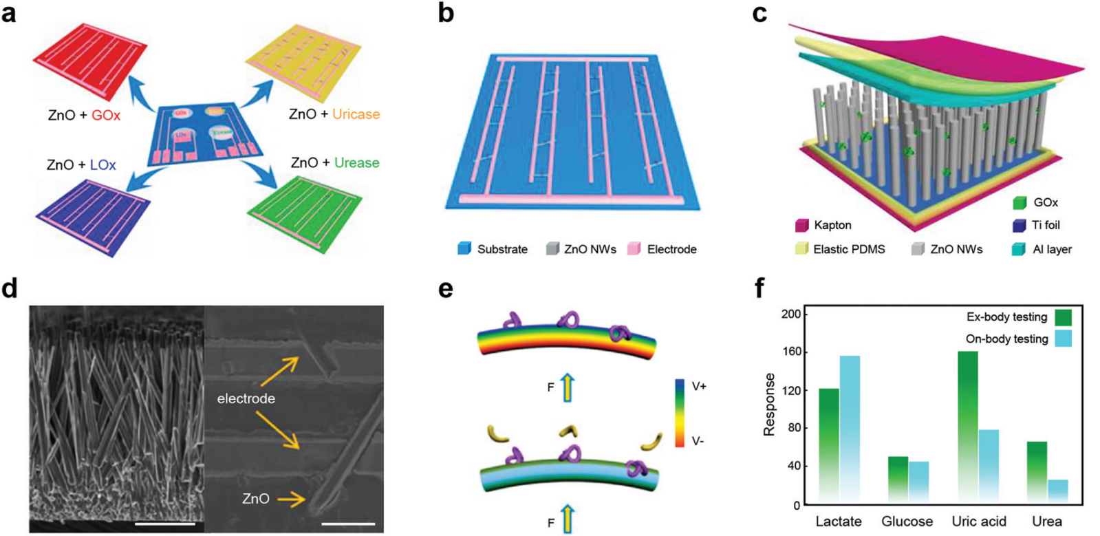 图 14 用于汗液传感的 PENG。 (a) 四个用于汗液分析的自供电可穿戴无创压电生物传感单元。(b) 自供电可穿戴无创电子皮肤的横向设备架构图。(c) 自供电可穿戴无创电子皮肤的垂直设备架构图。(d) ZnO 纳米线阵列和桥接两个 Ti 电极的单个 ZnO 纳米线的 SEM 图像。比例尺,10 μm。(e) 改性 ZnO 纳米线在纯水中通过施加变形产生的压电电位。(f) 对身体和体外测试的反应进行比较。