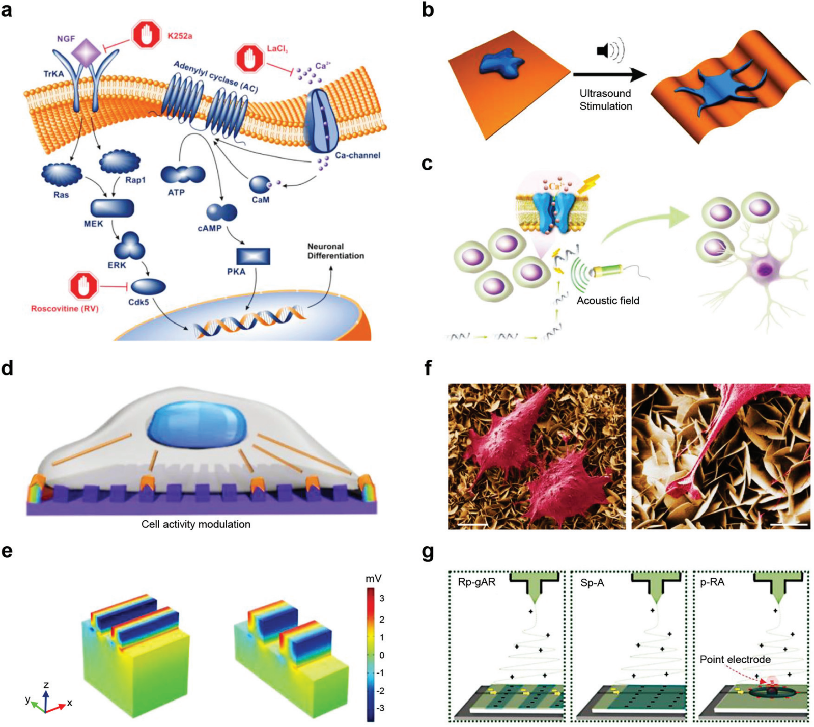 图 15 用于细胞活性调节的 PENG。 (a) 说明影响 PC12 分化的细胞内途径。(b) 压电 β-PVDF 膜的超声刺激示意图,诱导 PC12 细胞的神经元分化。(c) 高度可控微电机诱导目标神经干细胞分化的示意图。(d) 在具有纳米级条纹阵列的 PVDF 表面上生长的活细胞的固有细胞力。(e) 不同条纹阵列的 PVDF 电学模拟结果。(f) 形态和 NG 细胞相互作用的 SEM 图像。比例尺,5 μm(左)和 2 μm(右)。(g) 不同旋转膜的简化生成机制。